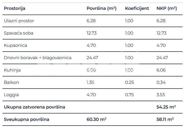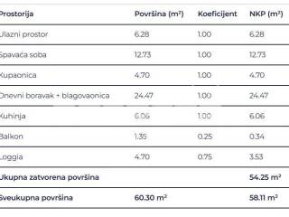 Prostrani dvosobni stan sastoji se od spavaće sobe, kupaonice, hodnika, dnevnog boravka s kuhinjom i blagovaonicom, loggie i natkrivenog balkona.