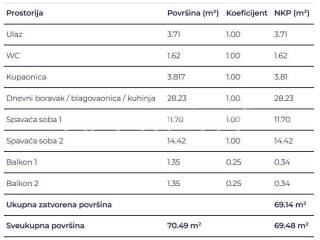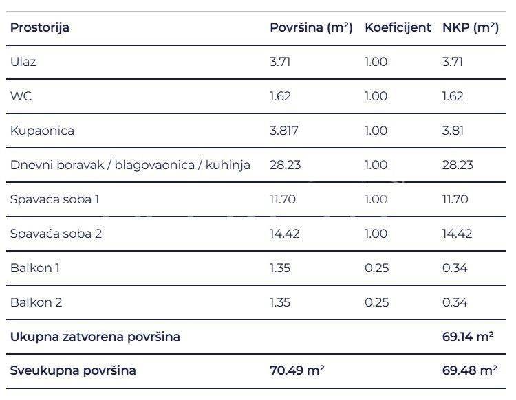 Prostrani dvosobni stan sastoji se od 2 spavaće sobe, kupaonice, wc-a, hodnika, dnevnog boravka s kuhinjom i blagovaonicom i 2 balkona.