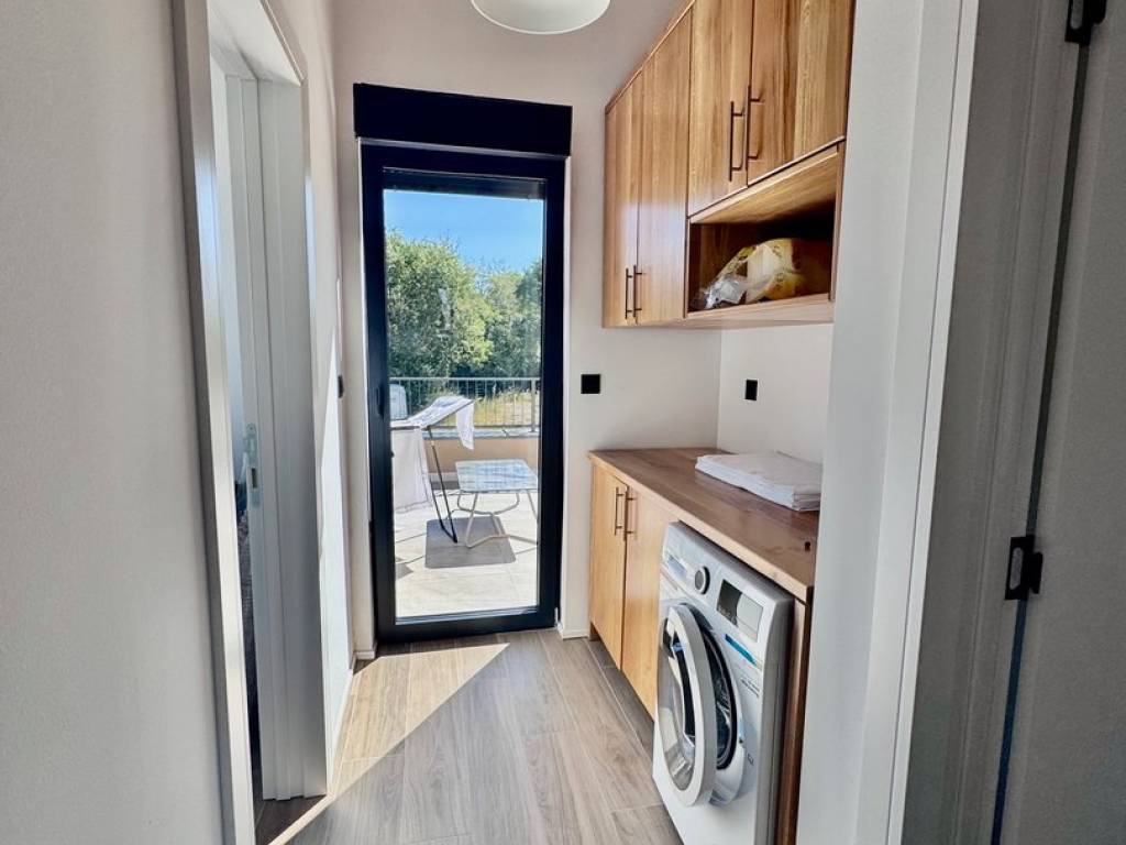 Na prvom katu se nalazi hodnik, praonica rublja, spremište, dvije spavaće sobe i dvije kupaonice, te velika terasa (19 m2) s prekrasnim pogledom na zelenu okolinu.