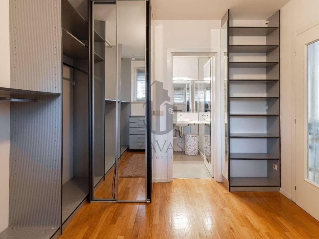 Raspored prostorija iznimno je funkcionalan: ulazni hodnik vodi u prostrani dnevni boravak povezan s potpuno opremljenom kuhinjom, glavnu spavaću sobu, garderobnu sobu te dvije kupaonice s WC-ima.