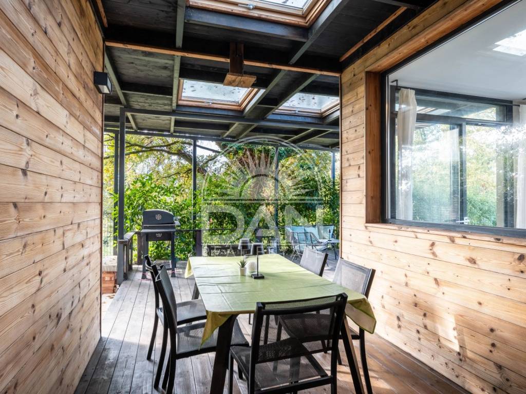A special emphasis has been placed on connecting the interior with the exterior. From the living area, there is access to spacious terraces – a covered one with skylights that let in additional light, and an open area with a 30 m² swimming pool. The landscaped garden and carefully selected details perfectly complement the house’s modern architecture.