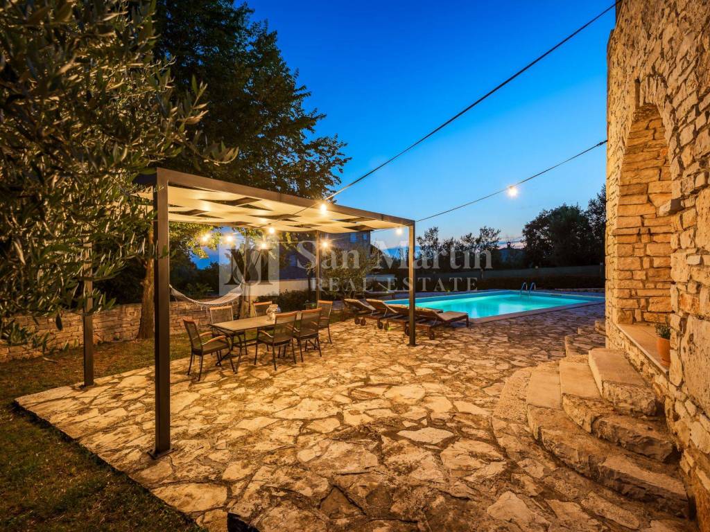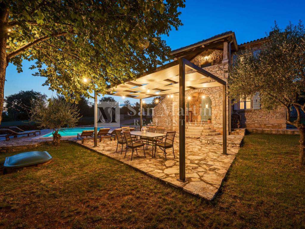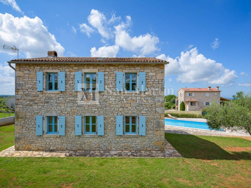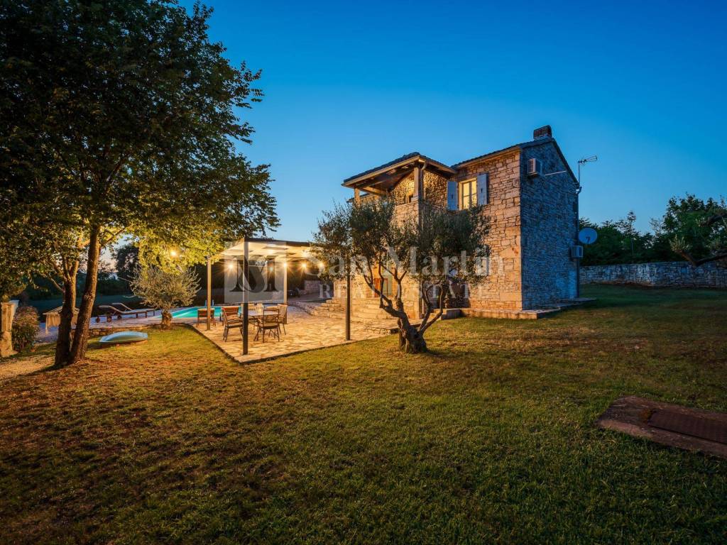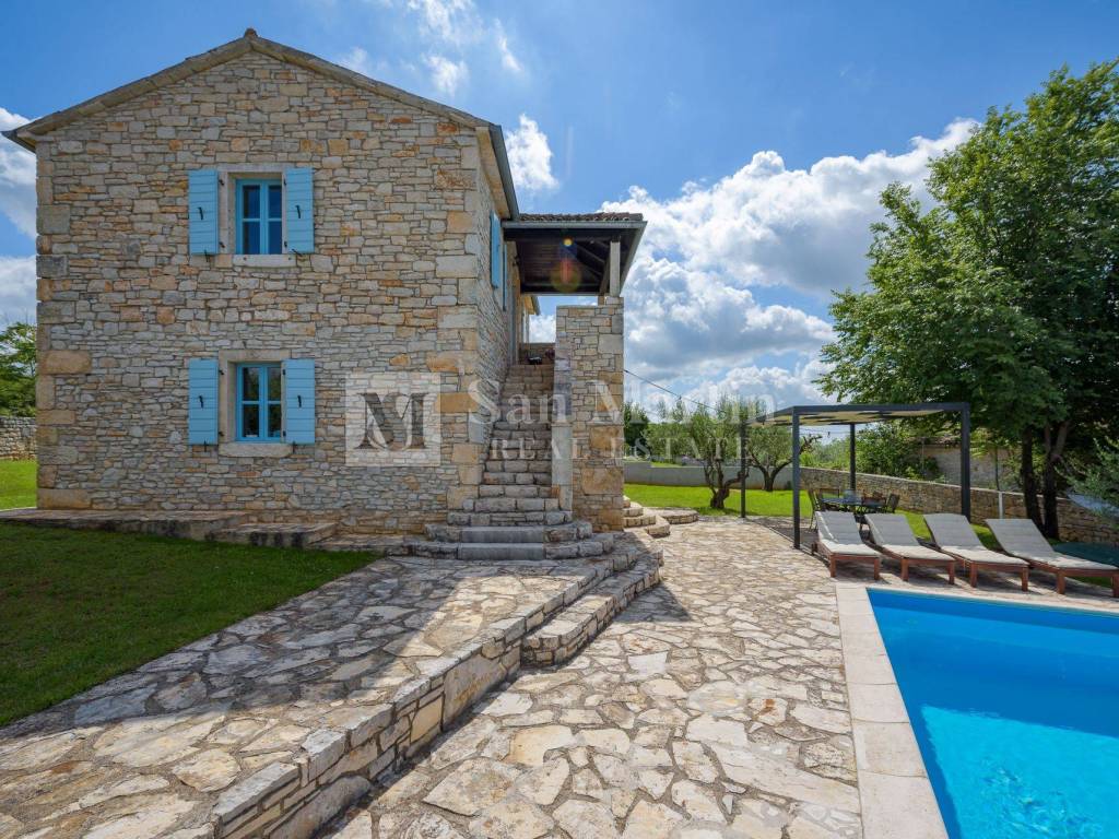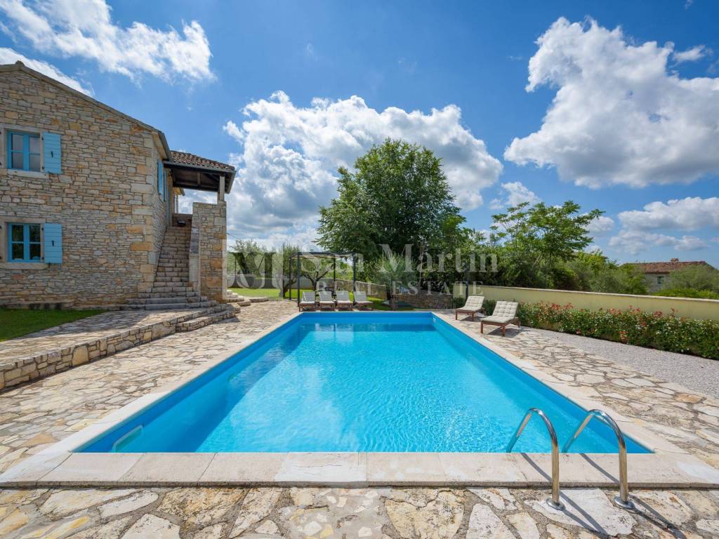 Not far from shops and other amenities, in a peaceful Istrian village, this beautiful stone house with a swimming pool and panoramic sea view is for sale.