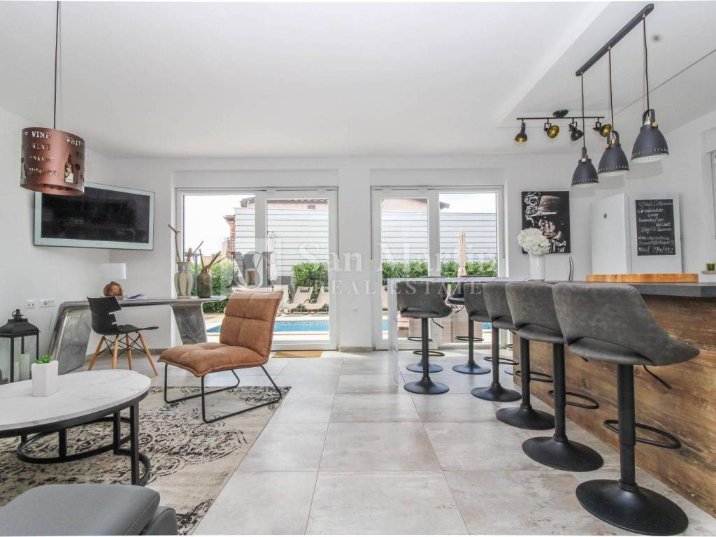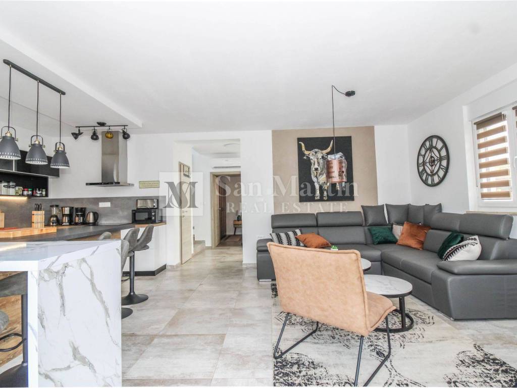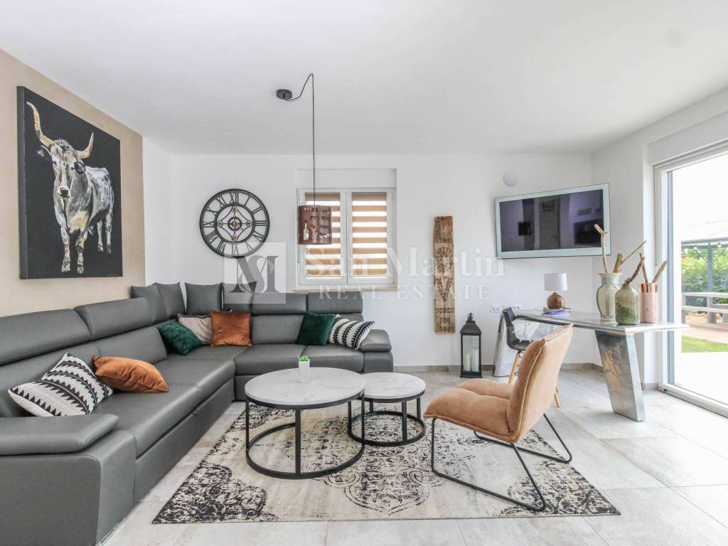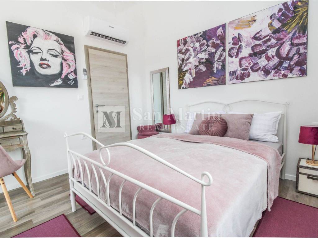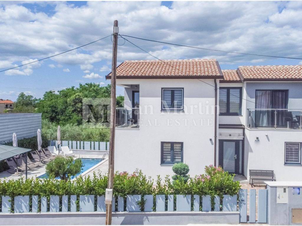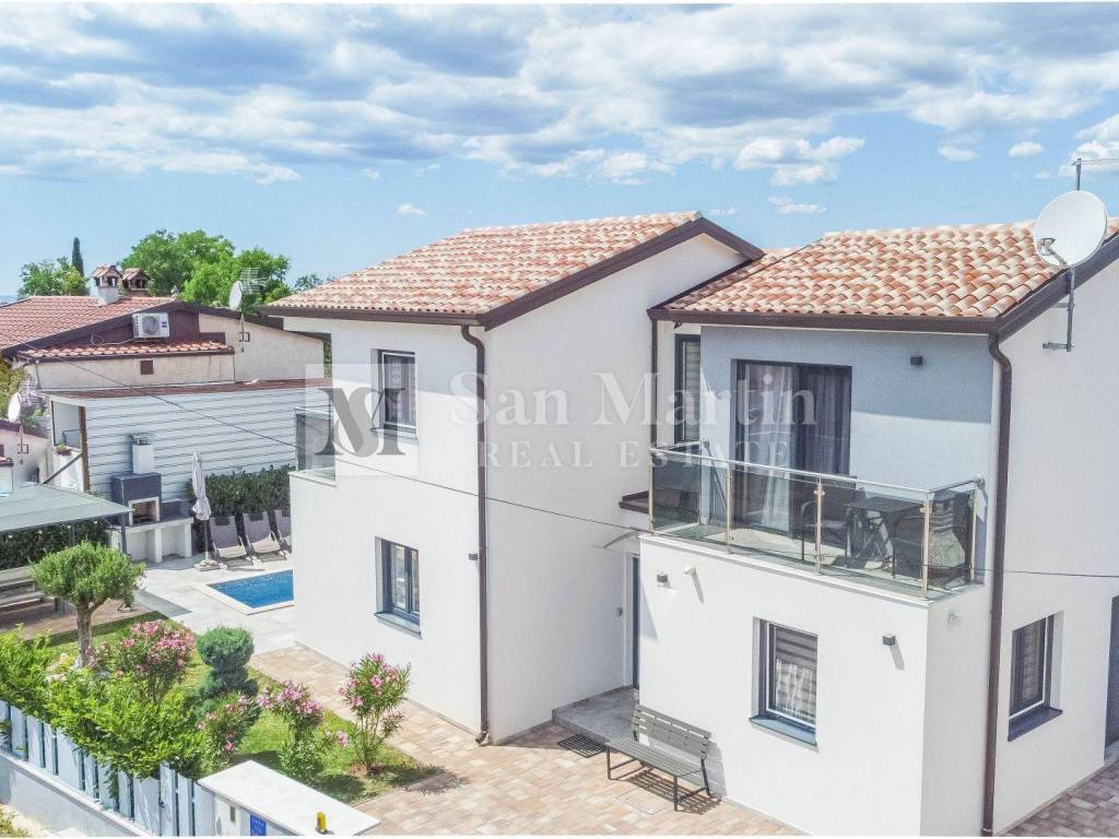 This house of 125 m2 is located in a quiet place not far from Poreč on a small landscaped garden. The house is spread over two floors. On the ground floor there is a living room with an open kitchen and dining room, a bedroom with its own bathroom and a storage room. And on the first floor there are three more bedrooms, one of which has its own bathroom, and the other two have a shared bathroom. The rooms also have balconies with a view of the sea.