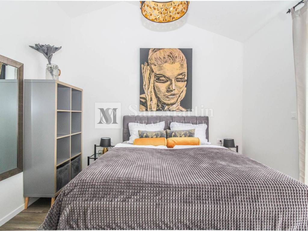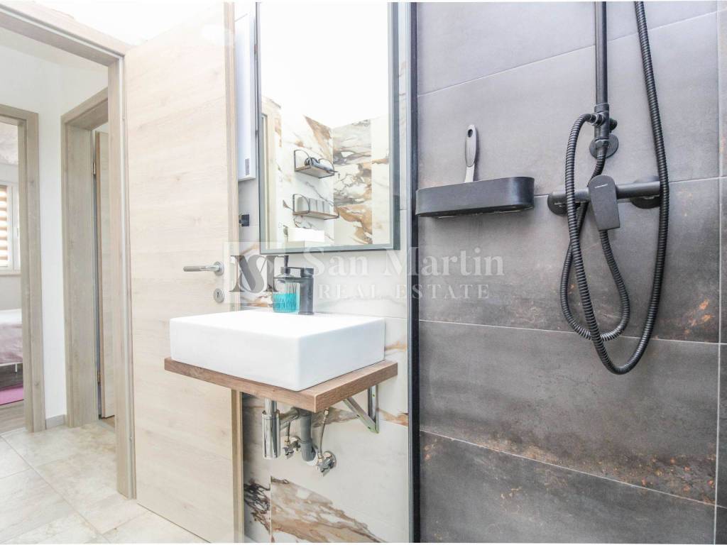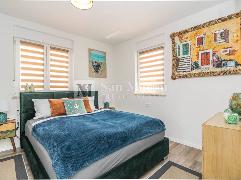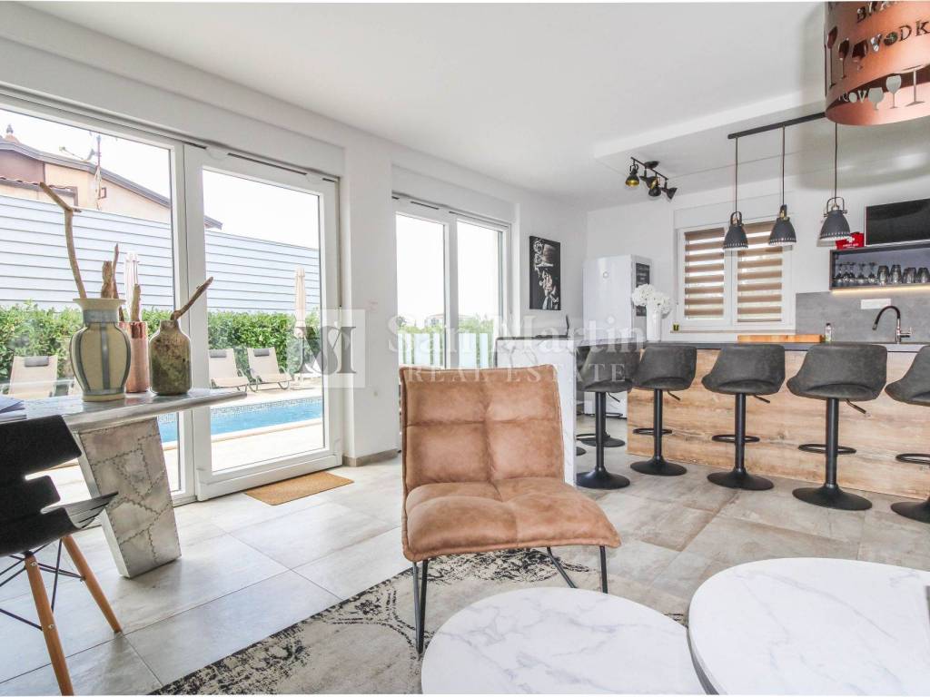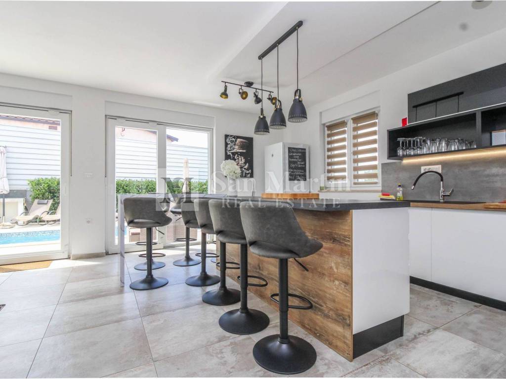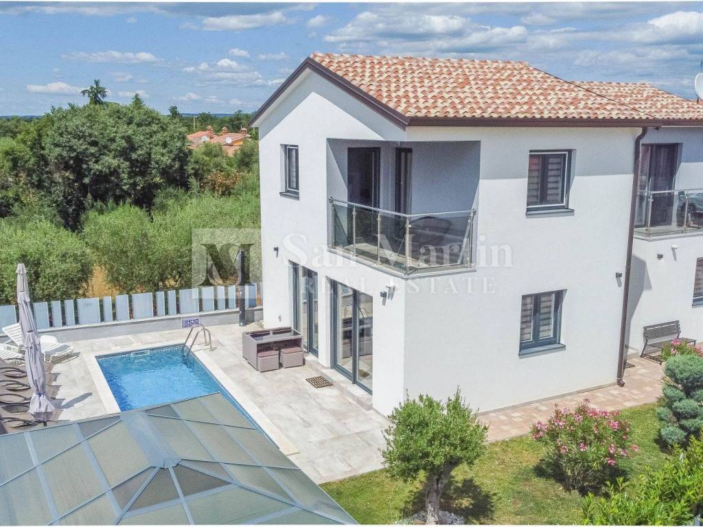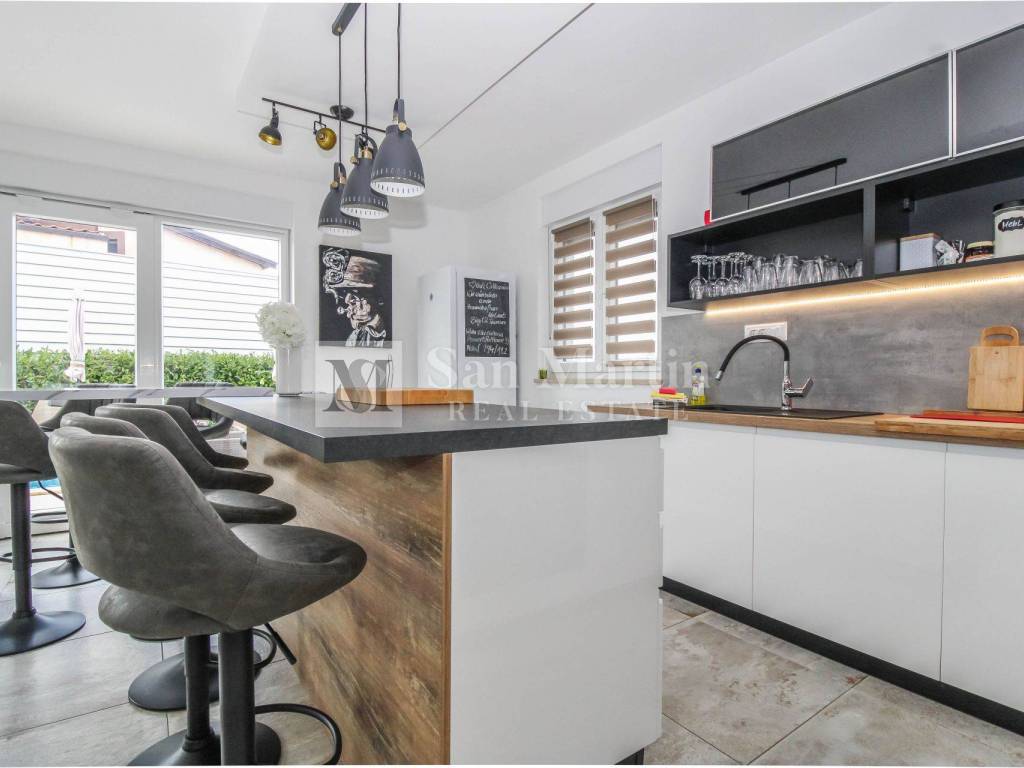 This house of 125 m2 is located in a quiet place not far from Poreč on a small landscaped garden. The house is spread over two floors. On the ground floor there is a living room with an open kitchen and dining room, a bedroom with its own bathroom and a storage room. And on the first floor there are three more bedrooms, one of which has its own bathroom, and the other two have a shared bathroom. The rooms also have balconies with a view of the sea.