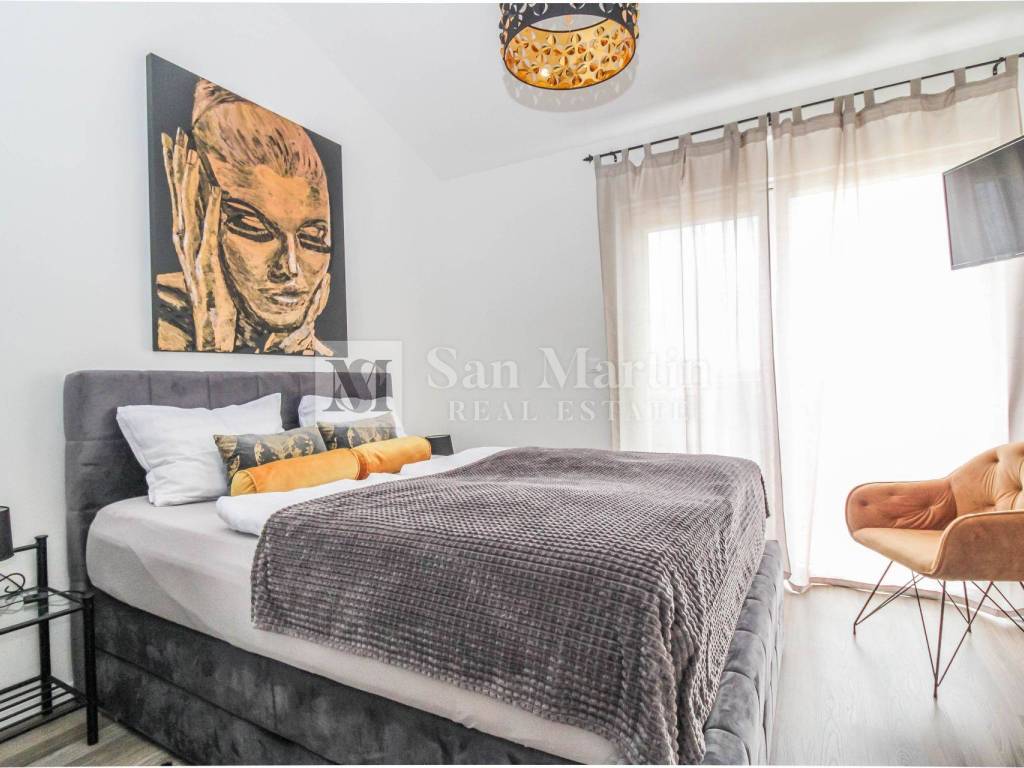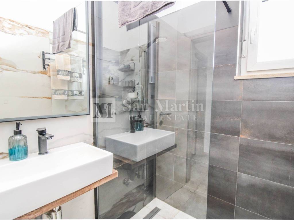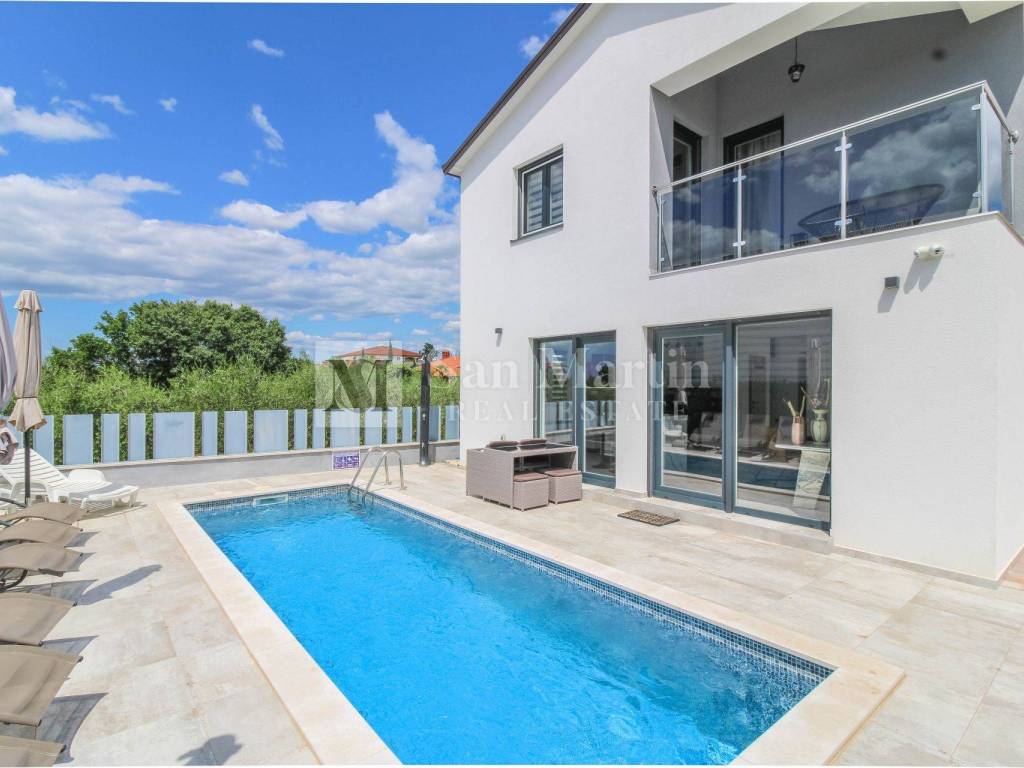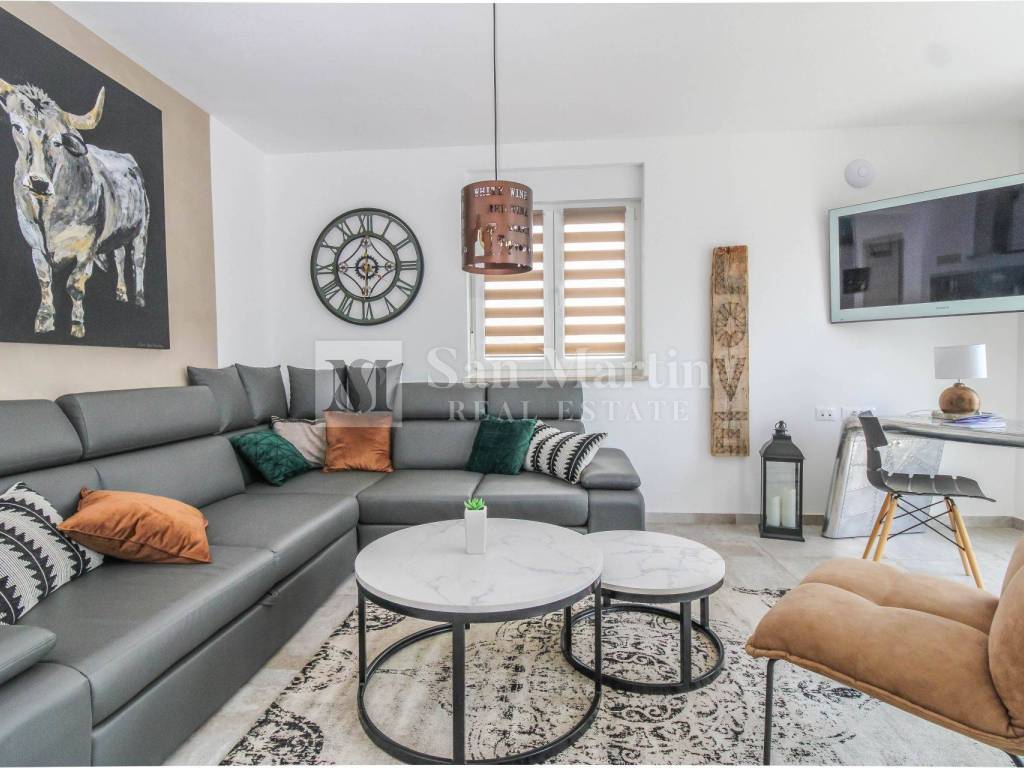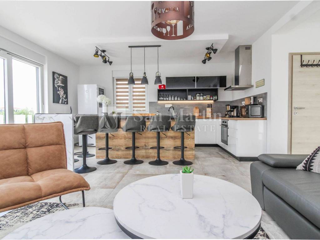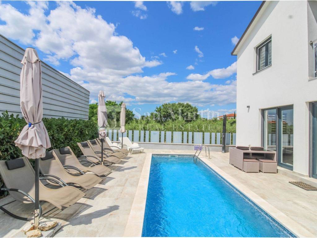 This house of 125 m2 is located in a quiet place not far from Poreč on a small landscaped garden. The house is spread over two floors. On the ground floor there is a living room with an open kitchen and dining room, a bedroom with its own bathroom and a storage room. And on the first floor there are three more bedrooms, one of which has its own bathroom, and the other two have a shared bathroom. The rooms also have balconies with a view of the sea.