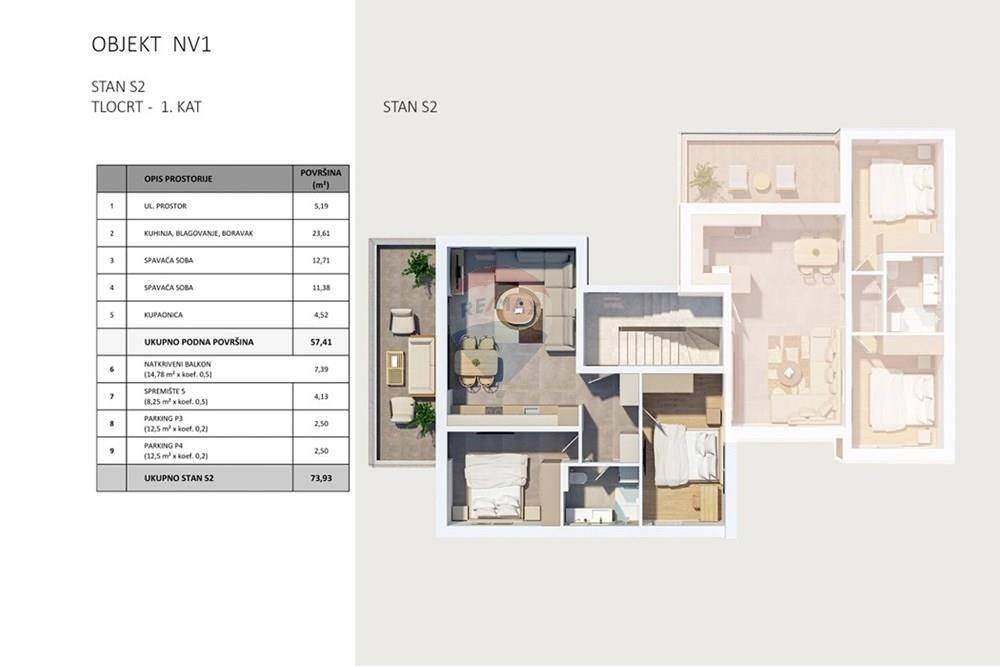OLIVE TREE VILLAGE is the newest project, consisting of 5 urban villas situated on a gentle slope with panoramic views of the town of Novalja and the entire archipelago. Due to the gentle slope, all apartments have a sea view, thanks to large terraces that ensure enjoyment of the beauty of the Adriatic Sea. The villas are located near the city beach and within walking distance from the center of Novalja. All apartments have a guaranteed parking space, connected by a pedestrian path to the entrance of the villas. The apartments feature large glazed surfaces, allowing for an unobstructed view of the beauty of Pag Island. The exterior PVC joinery is of the latest generation, with a minimal profile width and k < 1.1 w/m2K, and through them, you can access large terraces with glass railings that do not obstruct the view. All windows and balcony doors have electric shutters and mosquito nets, providing exceptional living conditions. The façade system uses the ETICS system for maximum energy efficiency. The air conditioning units are of maximum energy efficiency and consume very little energy. (The "multi split" system is designed for both heating and cooling, with an internal unit in each room), and the outdoor units are discreetly placed behind a mesh structure, making them "invisible." The ceramics are Italian, rectified, large format, and in the bathrooms, there are "walk-in" showers with modern glass partitions, with the aesthetic line complemented by high-quality sanitary ware and fittings, as well as built-in toilets. The stairwell features modern railings and quartz coverings in light tones, which match the color of the stone from Pag Island. The doors are top-quality anti-burglary doors with multi-point locking. The interior doors are of superior quality, lacquered with hidden hinges and magnetic locks. The plots are beautifully landscaped with carefully selected horticultural solutions and have automatic irrigation systems. All the boundary walls of the plots and surroundings are made of native dry stone walls from Pag Island. The apartments have guaranteed storage in the basement for sports equipment and similar items.