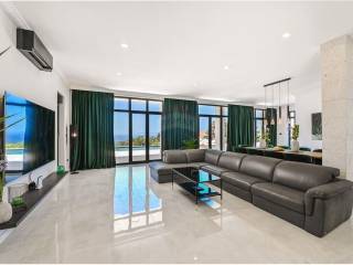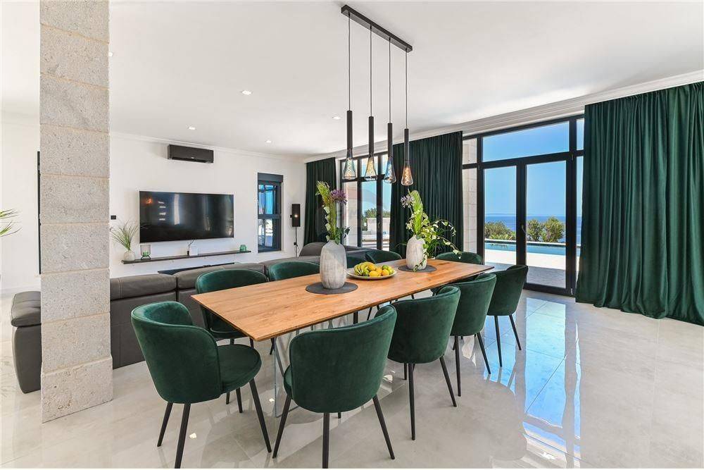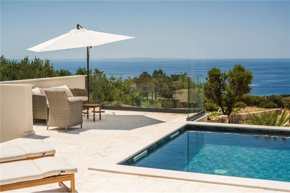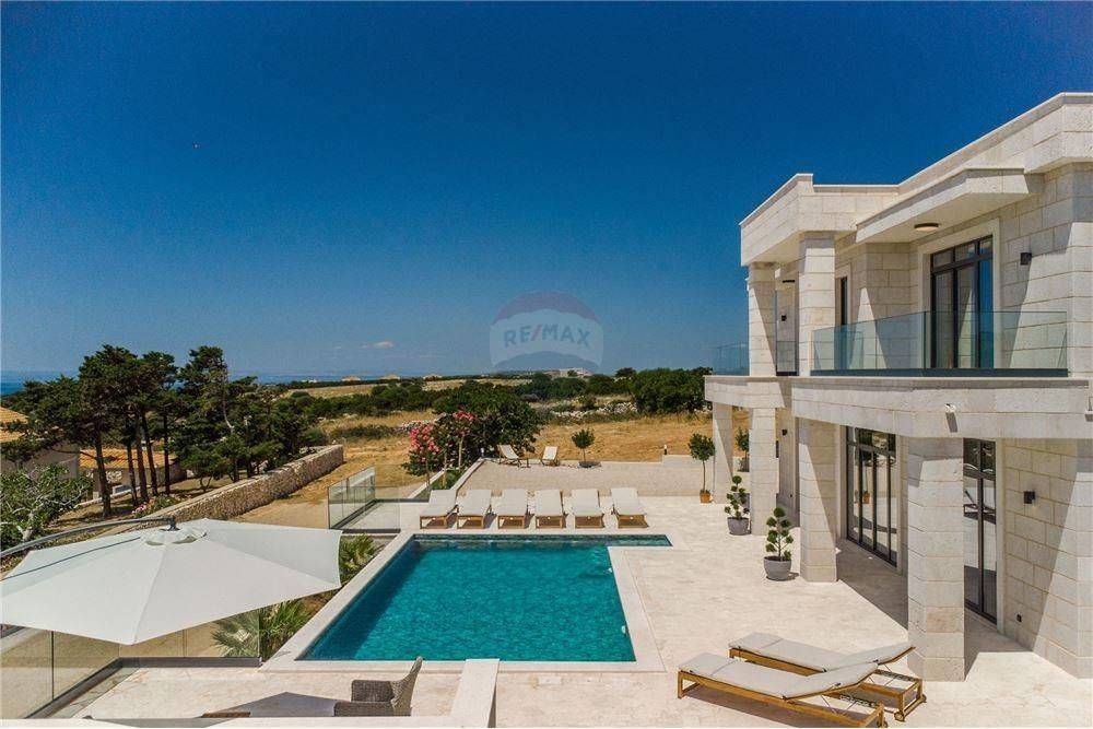 On the ground floor there is a kitchen with dining room and living room, 2 bathrooms, one bedroom. Internal stairs lead to the first floor where there are FOUR bedrooms and FOUR bathrooms. The ground floor of the house leads to a covered terrace equipped with a dining area and a barbecue. In the yard in front of the house there is a sunbathing area and a swimming pool with a view of the sea and the surrounding area.