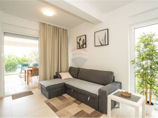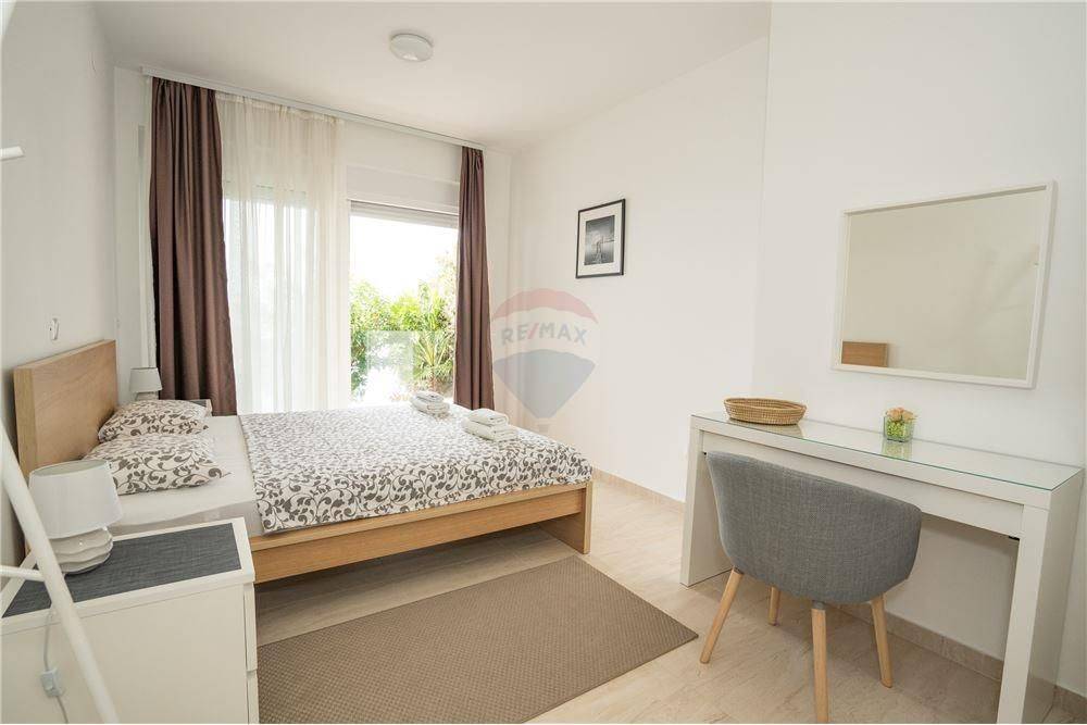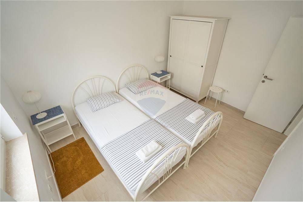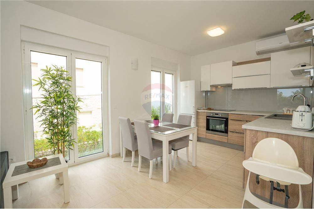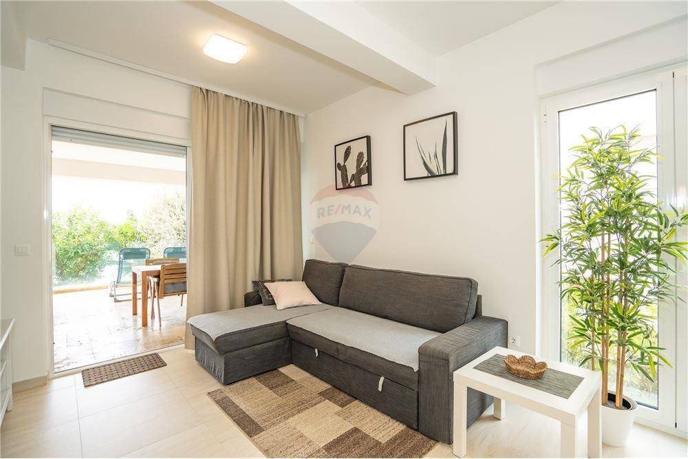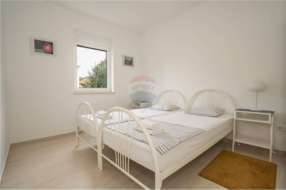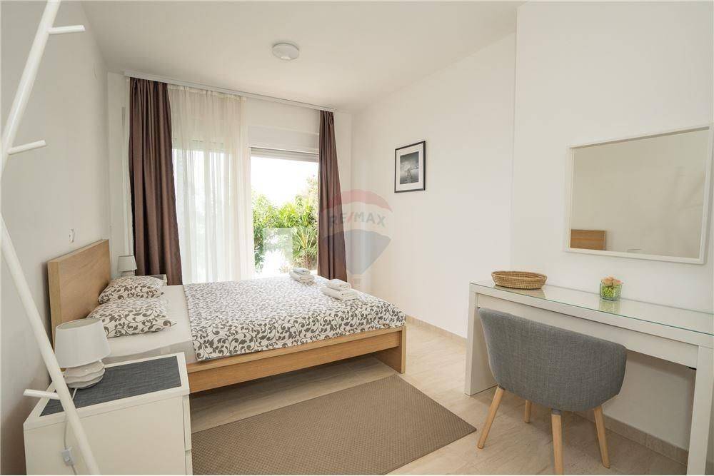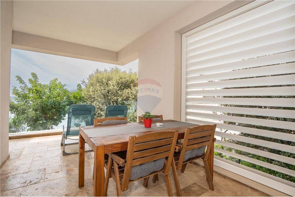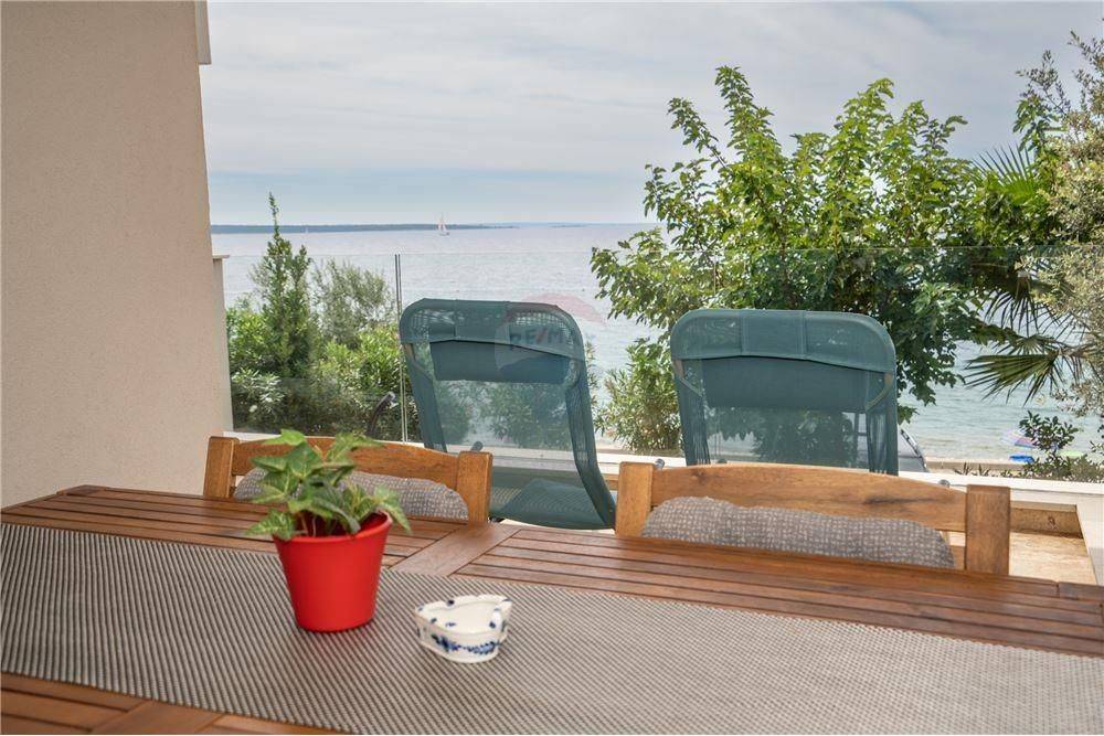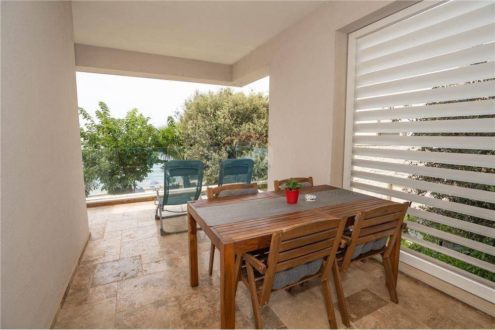 Two-bedroom apartment for sale in Mandre, FIRST ROW TO THE SEA. The 74.79 m2 apartment is located on the FIRST floor of a residential building with a total of 9 units. It consists of an entrance hall, TWO bedrooms, kitchen/dining room/living room, bathroom and a spacious covered terrace. The entrance hall is well designed, the possibility of installing a built-in wardrobe for storing things. The west-facing bedroom has access to a covered terrace. The apartment is for sale fully furnished, exterior PVC joinery with automatic lifts. The apartment is spacious and well lit from the west and north sides. The outdoor terrace covered with high-quality stone, the glass fence provides an unobstructed view of the sea. The possibility of installing a wood or pellet stove, air-conditioned.