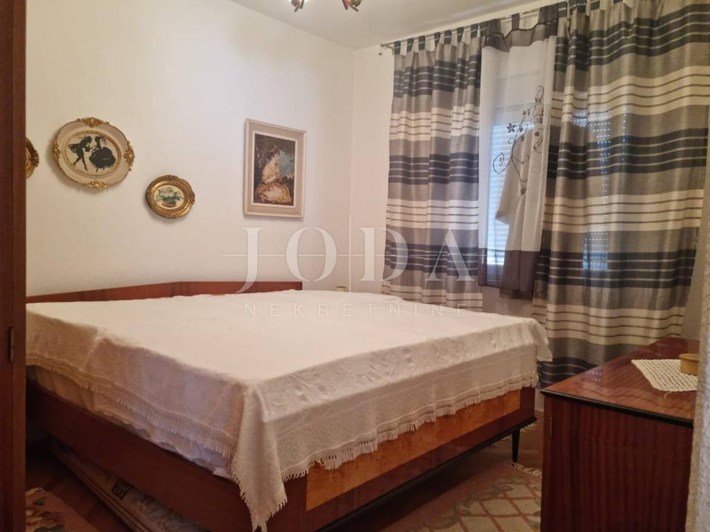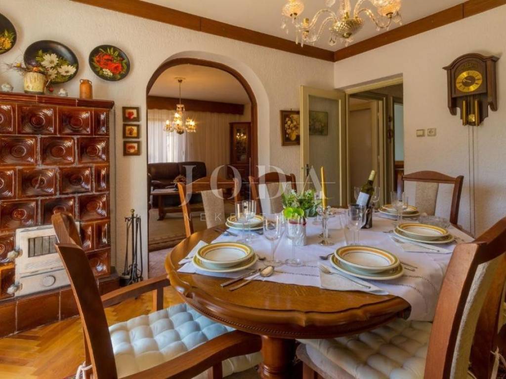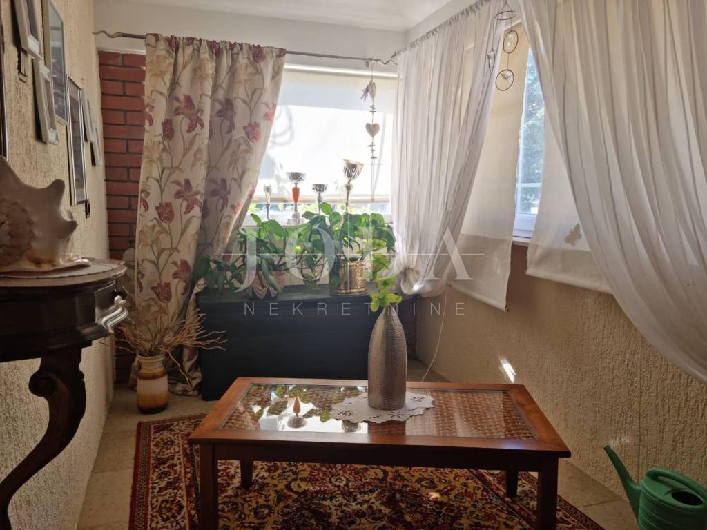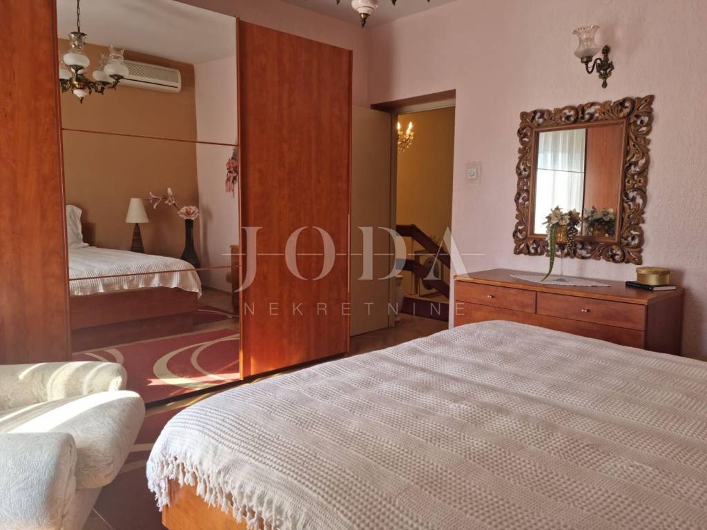 The first floor has a separate entrance from the outside, external stairs. On the first floor there is a large living room, kitchen, dining room, bedroom with balconies, bathroom, hallway, glazed veranda, and a larger terrace with barbecue. On the second floor there are four bedrooms (two with balconies), bathroom and hallway.