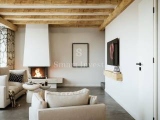 The floors and wet rooms are finished with modern microcement, while high-quality parquet flooring is installed on the upper floor. A rustic wood-burning fireplace in the living room adds extra warmth and ambiance during the winter months.