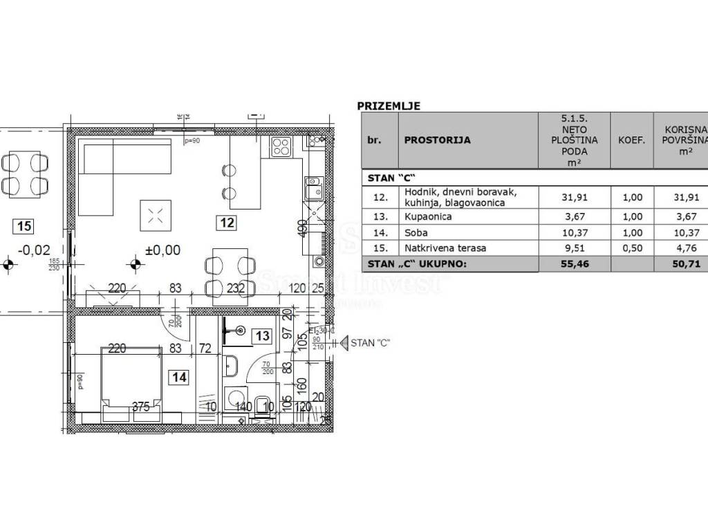 APARTMENT C with a net usable area of 50.71 m2 and a garden of 34 m2 is situated on the ground floor and consists of a corridor, living room with kitchen and dining area, bedroom, bathroom, and an covered terrace of 9.51 m2 (coefficient 0.5=4.76 m2). The apartment also has a garden of 34 m2, a storage room of 1.74 m2 and a parking space of 12.48 m2.
