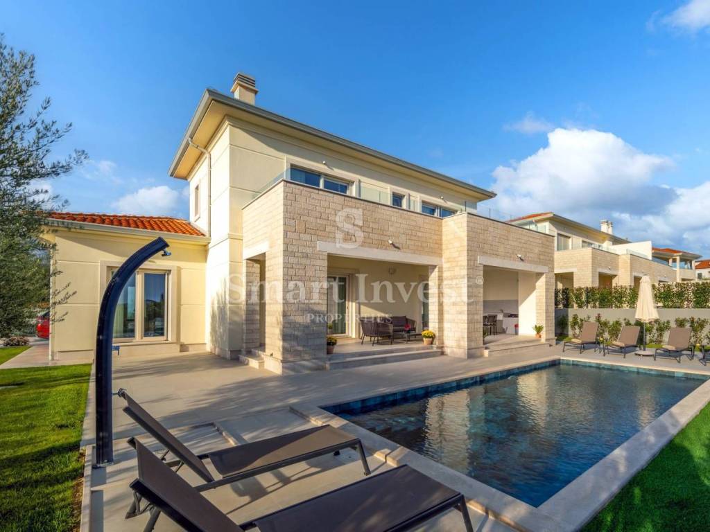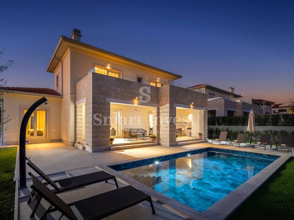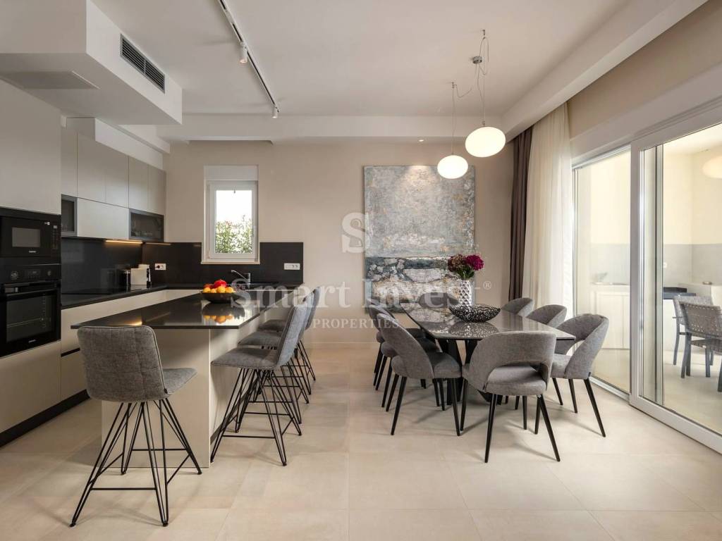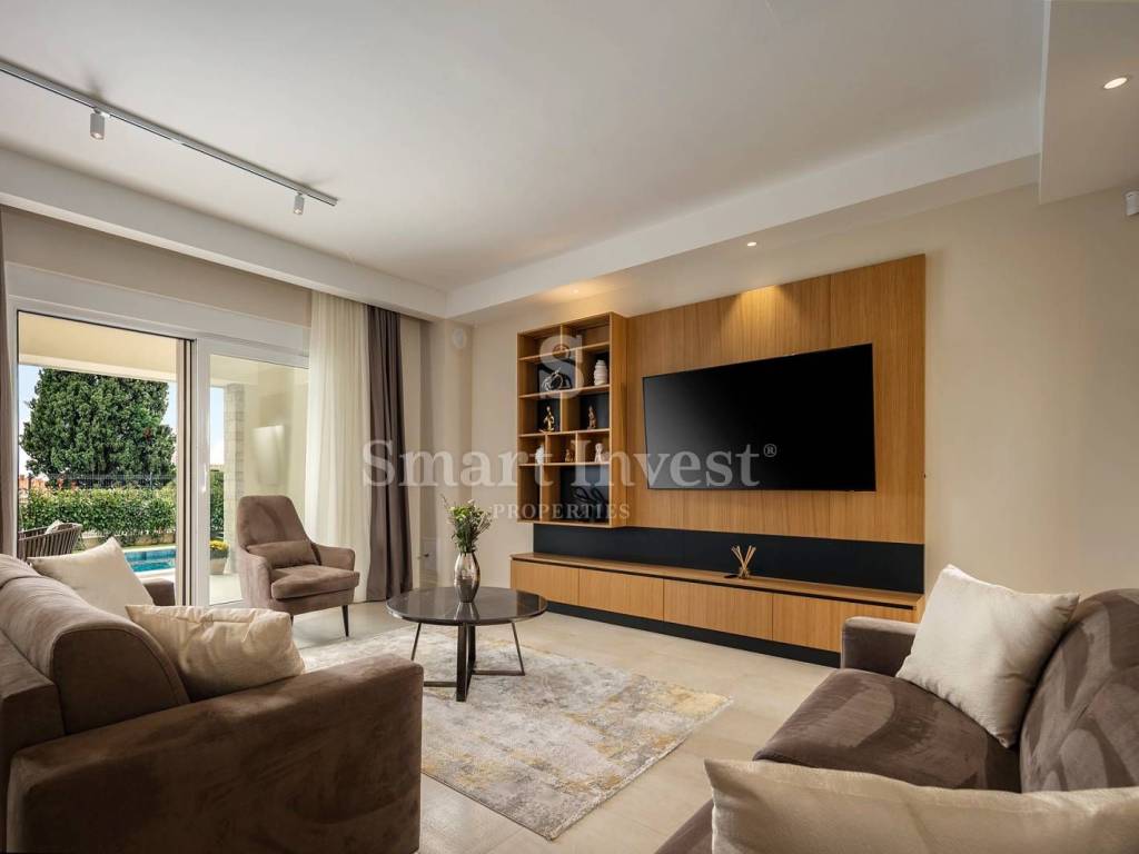 On the ground floor there is an open space living room with kitchen and dining area, large bedroom with en-suite bathroom, guest toilet, technical room with laundry room, spacious entrance hall with staircase leading to the first floor. The living room has access to a covered terrace with a summer kitchen, and to a beautifully landscaped yard where is a large heated swimming pool with a sun deck, and a space for dining and enjoyment.