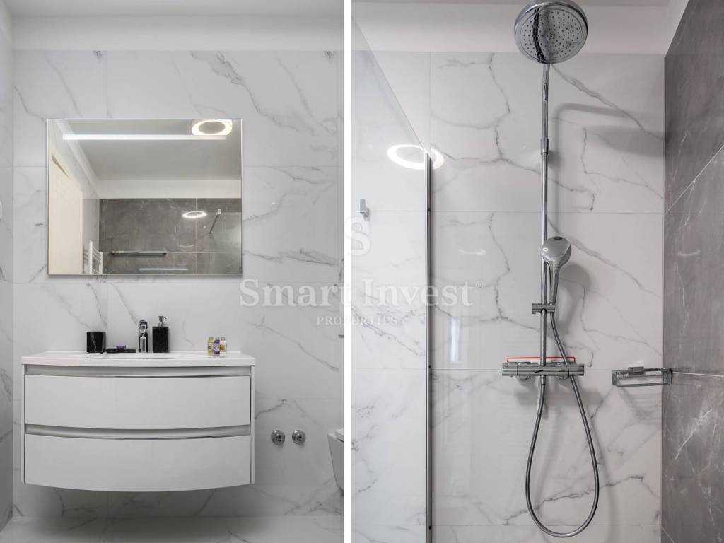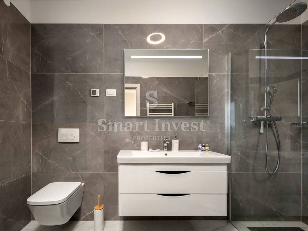 Upstairs there are two bedrooms with en-suite bathrooms and access to a large terrace with a beautiful view of the Italian Alps and the sea. An awning with electric control will soon be installed on the upper terrace.