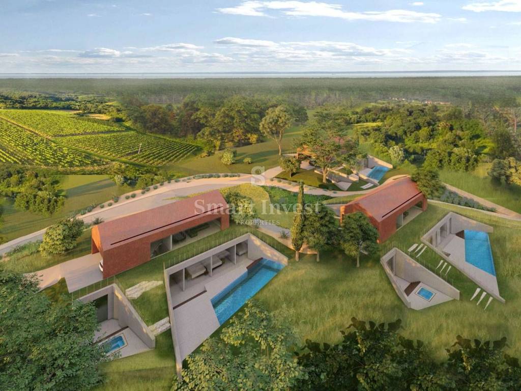 Zemljište za izgradnju tri ville za turističke svrhe nedaleko centra Brtonigle. Idejnim projektom je predviđeno da svaka od 3 ville ima površinu 285m2 i nalazi se na okućnici od 800m2 te funkcioniraju kao jedna cjelina. Ville su arhitektonski jednostavne, moderne i u potpunosti uklopljene u prirodni okoliš. Nalaze se na izdvojenoj građevinskoj zoni koja se neće širiti, stoga jamči budućim vlasnicima potpunu privatnost, mir, tišinu i odmor u zelenilu.
