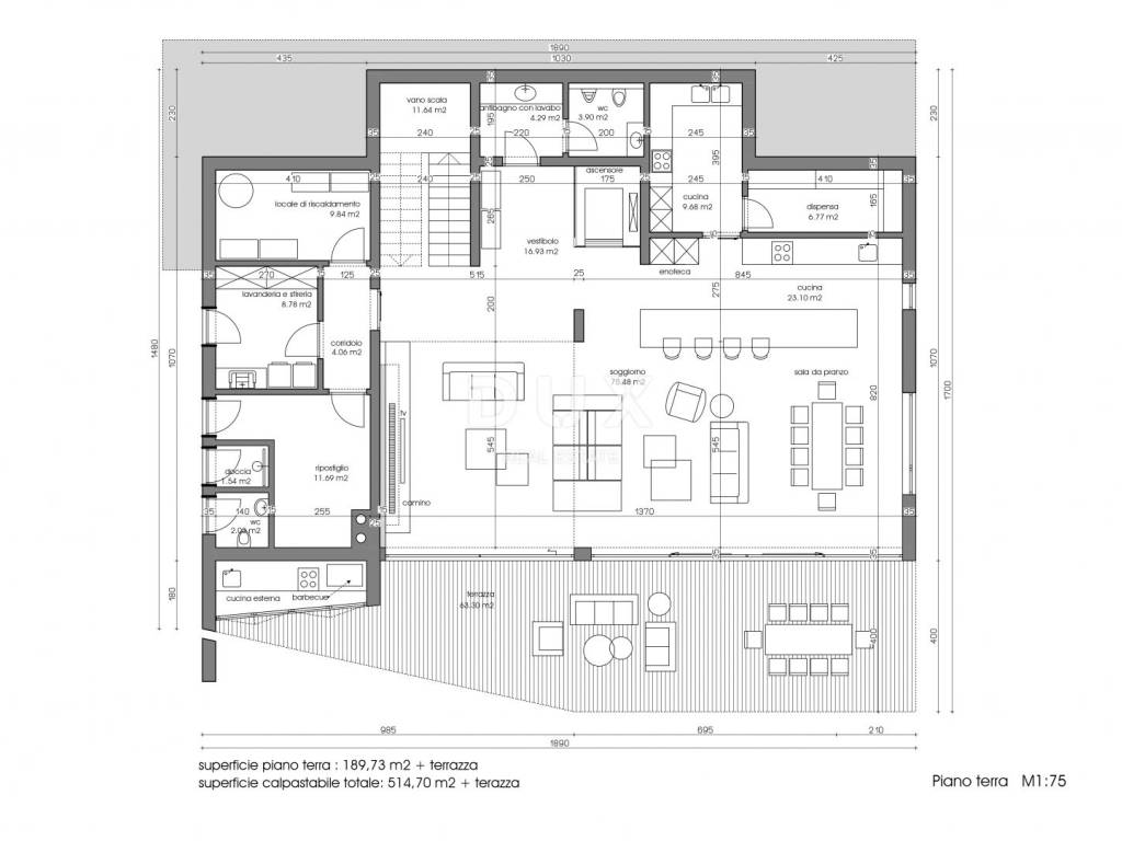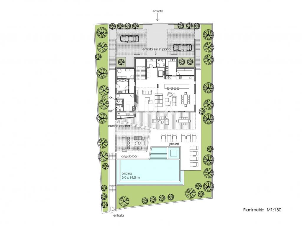 U prizemlju je osmišljen velik dnevni prostor open space koncepta površine 115 m, s prostranim dnevnim boravkom, blagovaonicom i kuhinjom s otokom. Staklene stijene pune visine otvaraju se prema natkrivenoj terasi od 63,30 m i bazenu, stvarajući savršenu povezanost unutarnjeg i vanjskog prostora. Uz dnevni dodatno na kvadraturu predviđena je dodatna kuhinja za osoblje ili vašeg privatnog "chef-a", utility soba, gostinjski toalet, vanjski toalet i kupaonica, te dodatna spremišta, čineći prizemlje funkcionalnim i luksuznim u isto vrijeme.