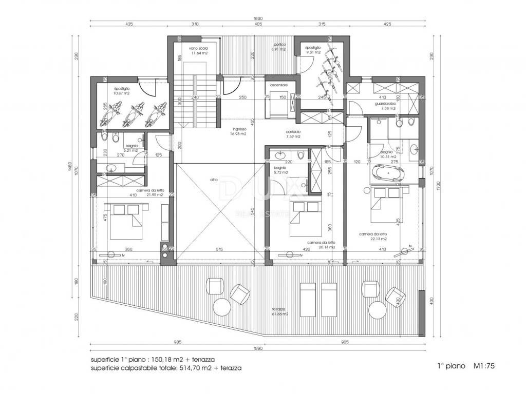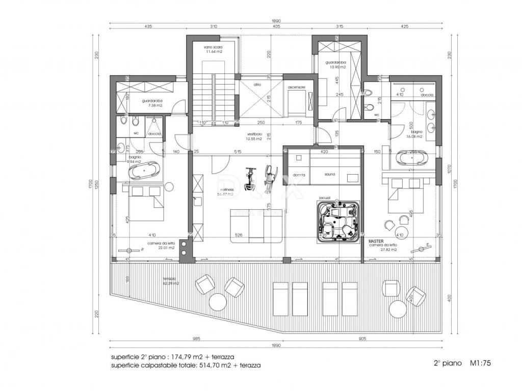 Na drugom katu nalaze se dvije ekskluzivne spavaće sobe od kojih svaka posjeduje svoju vlastitu kupanicu i walk-in garderobu, no jedna od ovih spavaćih soba predstavlja "master" spavaću koja ipak posjeduje nešto veće kupatilo s odvojenim walk-in tušem i kadom, te odvojenim toaletom, a i njezina walk-in garderoba većih je dimenzija. Na ovoj se etaži nalazi i prostrana wellness zona od 56 m sa saunom, jaccuzziem, dodatnom kuhinjom i kupaonicom, koju krasi izlaz na terasu od 62,29m2 s nezaboravnim panoramskim pogledom na more, a kojoj pristup imaju i već spomenute spavaće sobe.