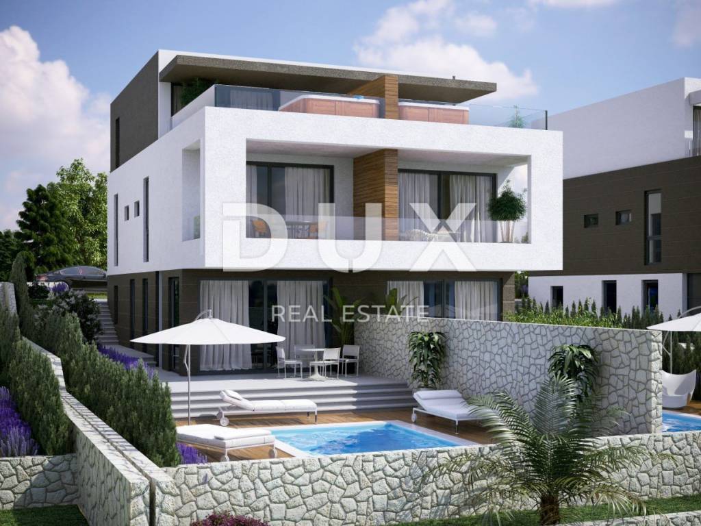 On the island of Pag in Novalja, just 200 meters from the sea, there are three urban villas with 4 residential units in each. The two-bedroom apartments on the ground floor of 62 and 69 m2 have a garden, a swimming pool and one parking space, while the two-storey apartments are located on the first floor and have a jacuzzi on the roof terrace. Top-quality new buildings surrounded by greenery in a beautiful location near the city and the sea.