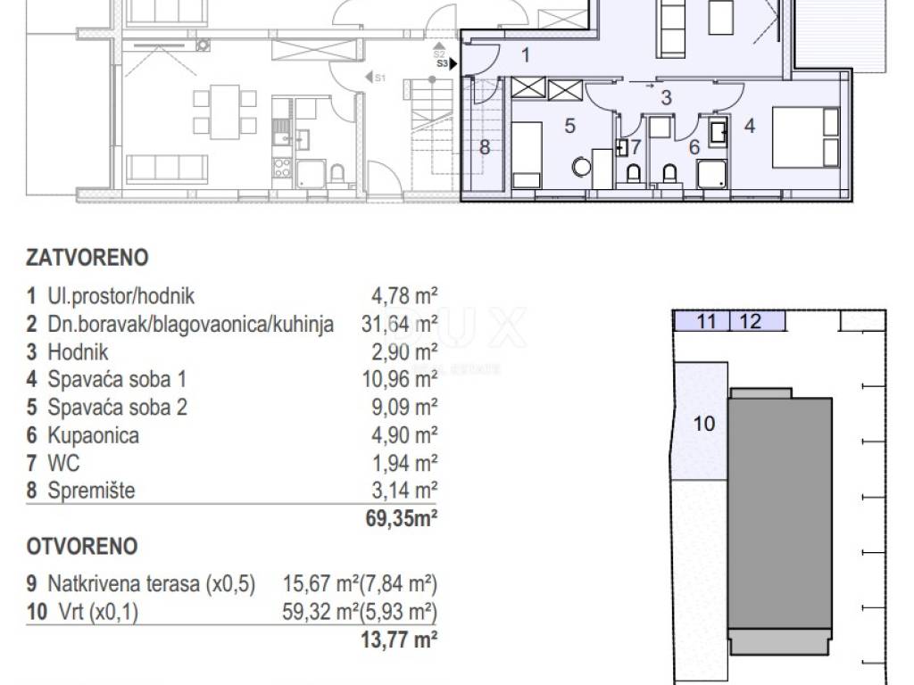 Apartment S3 is located on the ground floor and consists of two bedrooms, a bathroom with underfloor heating, an additional toilet, a spacious living room with kitchen and dining area, a storage room and a covered terrace ideal for relaxing on warm summer evenings. The apartment also has a garden that provides additional space for privacy and outdoor enjoyment, as well as two parking spaces. All rooms are equipped with air conditioning, while the apartments on the first and second floors offer a beautiful view of the sea.