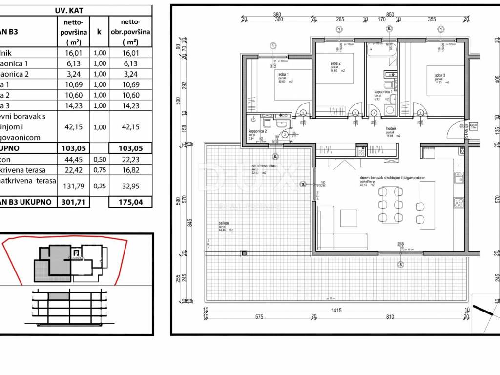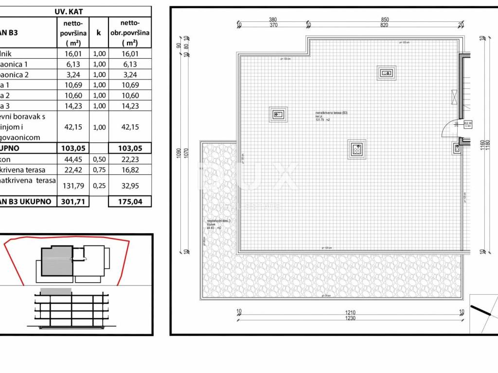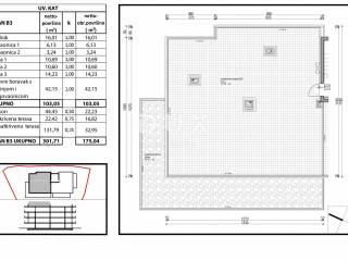 In the quiet settlement of Tara, just 350 m from the sea and a ten-minute walk to the well-maintained beaches, there is a modern new building of top quality with a total of 13 apartments. On the very third floor of the building is this unique two-storey penthouse, which extends over 175.04 m of living space and represents a combination of luxury, comfort and a superb view. APARTMENT DESCRIPTION - B3 First floor: * spacious entrance hall with a designated cloakroom * large open space area of as much as 42.15 m with a living room, kitchen and dining room, and where there is also access to a spacious, partially covered terrace that stretches the width of the entire apartment. * three spacious bedrooms. * then two modern and comfortable bathrooms. Second floor: An internal staircase leads to the roof terrace of 131.79 m, which offers a panoramic and unobstructed view of the sea and the Istrian landscape. This space offers unlimited customization options - future owners can create their own oasis with a jacuzzi, summer bar, lounge area or a space for socializing and having fun with family and friends. ADDITIONAL INFORMATION - The building is built according to the highest construction standards, and the apartment is equipped with: * earthquake-resistant construction * three-layer PVC joinery with roller shutters and mosquito nets * electric underfloor heating in all rooms * air conditioning in each room * 10 cm of high-quality facade insulation (styrofoam and wool) * security doors * an elevator connecting all floors of the building * the apartment has its own two parking spaces included in the price of the apartment, while storage rooms are available with an additional purchase. ADDITIONAL: * Planned completion of construction and move-in: 12/2025. years * Ownership in order, natural person (1/1) Ideal opportunity for a luxurious family home, holiday apartment or investment with a high return through tourist rental. This apartment is not just real estate - it is a real lifestyle choice for those who want to enjoy luxury, comfort and spectacular sea views.