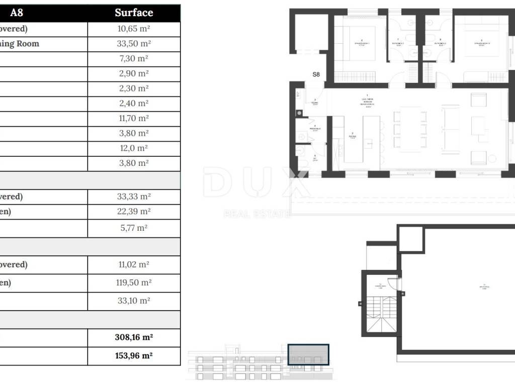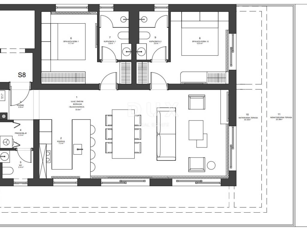 In the quiet and charming town of Zaton, just 45 meters from the beach, there is a new modern building with two entrances and two elevators that hides ten exclusive apartments. Each one has been carefully designed to provide maximum comfort and enjoyment - the ground floor apartments are enriched with private gardens, the apartments on the middle floors have spacious terraces, while the penthouses offer rooftop oases with installations for summer kitchens and jacuzzis, ideal for relaxed evening gatherings at sunset. All apartments are equipped with air conditioning in every room, while the penthouses additionally have underfloor heating throughout the interior. Penthouse A8 on the second floor with a net area of 153.96 m2 combines functionality and elegance. The layout includes two bedrooms, as many as two bathrooms, an additional toilet, a kitchen and an airy living room. What sets it apart is the covered terrace that perfectly connects the indoor and outdoor space, as well as a spacious roof terrace with a breathtaking sea view. The apartment also comes with two parking spaces, one outside and one in the garage, and a storage room, and the equipment includes underfloor heating throughout the apartment, electric shutters, security doors and a video intercom. Buyers also have the option of taking over the fully furnished interior, which allows you to move in without additional worries. A special benefit the buyer is exempt from paying real estate tax because the seller is a legal entity. Zaton is known for its long pebble beaches, crystal clear sea and peaceful atmosphere that combines the traditional Dalmatian atmosphere with modern amenities. In the immediate vicinity there is a resort with numerous amenities restaurants, cafes, sports fields and wellness programs, which makes this place ideal for both vacation and life throughout the year. Just a ten-minute drive away is Zadar, a city rich in history and culture, world-famous for its Roman forums, Romanesque churches, the Sea Organ and the Greeting to the Sun. If you are looking for a combination of luxury, comfort and a Mediterranean lifestyle, contact us for more information and to arrange a tour.