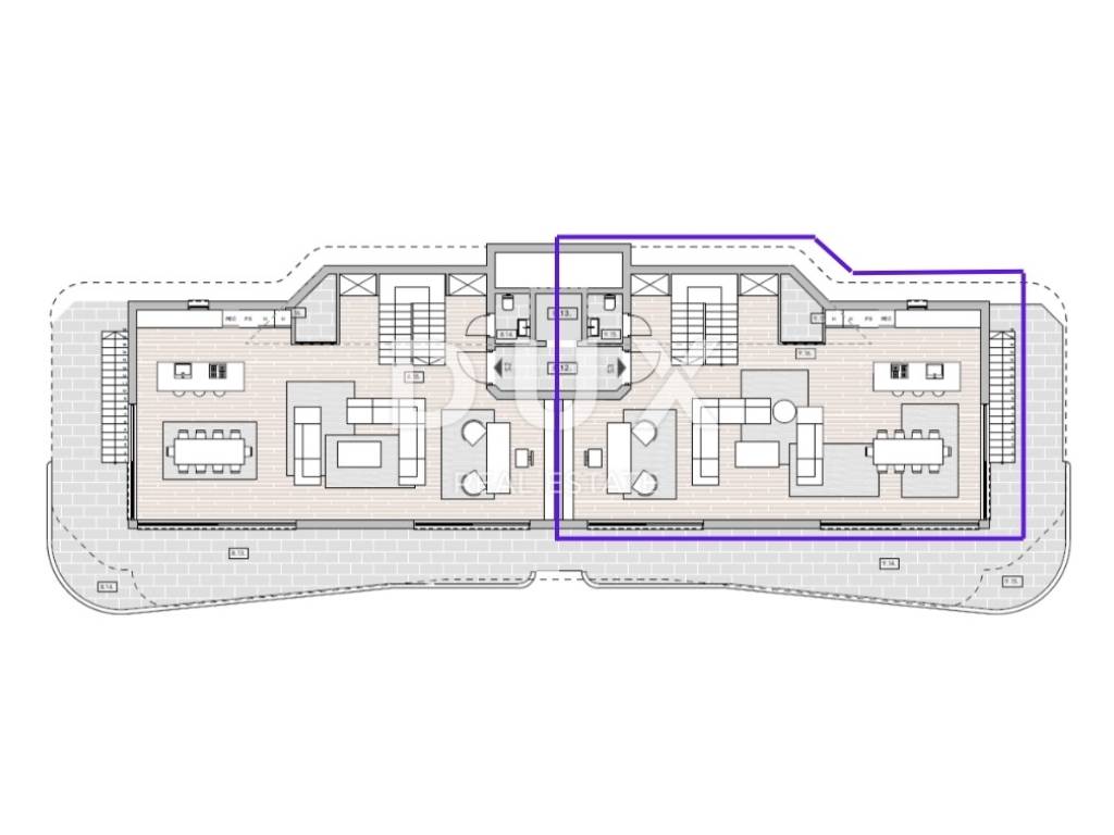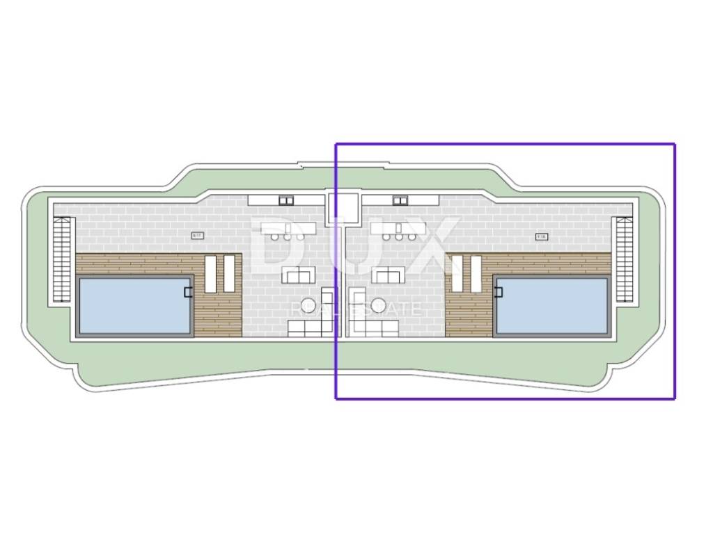 Dux is a top-notch new building that stands out as currently the closest to the sea and the very center of Opatija, and yet is available on the market. This luxurious building is located in a quiet, dead-end street with no traffic, which provides complete privacy and silence, and yet is ideally located so that you can easily walk, in just a few minutes, to the center of Opatija and the first beaches. Apartment S3 spreads over an impressive 293 m and occupies two floors - the second floor and the attic - with exclusive access to the roof. This two-story property exudes luxury, spaciousness and a thoughtful layout of the rooms, and the sea view is offered from both floors, the terrace and the private rooftop pool. The first floor is designed in an open concept and connects the kitchen, dining room and living room into a bright and airy unit ideal for socializing. There is also a guest toilet and a practical storage room on the same floor. On the second floor there are three spacious bedrooms, each with its own dressing room and luxurious bathroom, which provides maximum privacy and comfort. There is also an additional storage room and a sauna here, which further emphasizes the exclusivity of the apartment. Both floors have access to spacious terraces accessible from each room, and the highlight of this property is a private roof with a swimming pool and an unforgettable sea view. The apartment also has a storage room in the basement of the building, which further increases its functionality and value. The net sales size of the apartment with coefficients is 293 m2 (gross 424 m2) and the property comes with three additional garage parking spaces. The building is equipped with top-quality materials and technologies: - aluminum Schüco joinery (panorama version with thin profiles, tinted triple-layer glass) - first-class Italian ceramics - heat pump for each apartment + underfloor heating throughout the apartment - separate multi-split air conditioning system in each room - top-quality sanitary ware, floors and interior doors - elevator - garage with high ceilings - storage room for each apartment It is especially important to point out that the center of Opatija or the first beach is a very gentle downhill walk, within 5 minutes of easy walking, while by car it takes literally 60 seconds. This is a truly rare opportunity to buy a property in Opatija that combines a top location, luxurious equipment and impeccable quality of construction. To arrange a visit to the property, call the agent with confidence - consultation in German is possible.