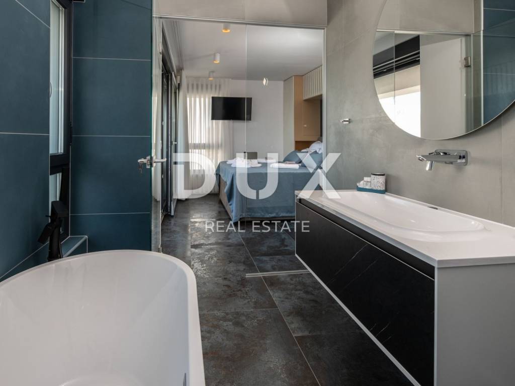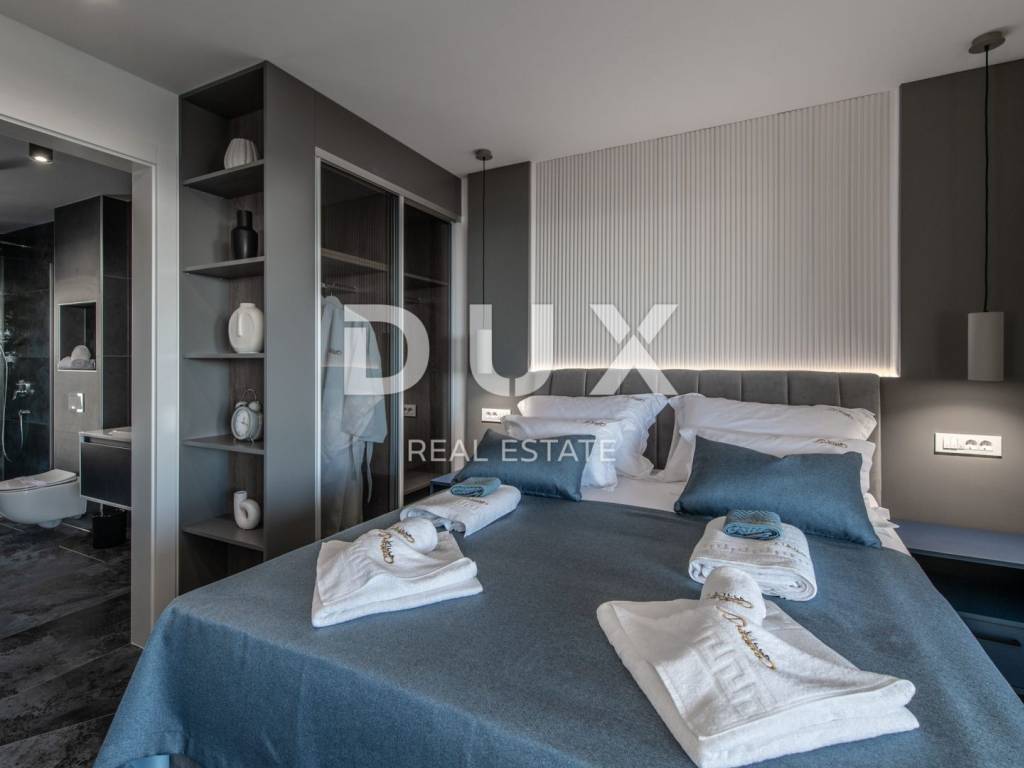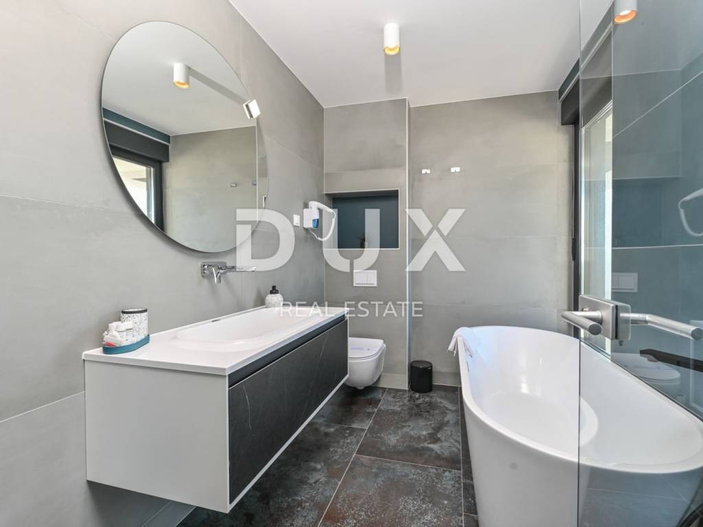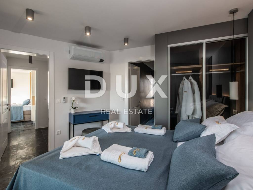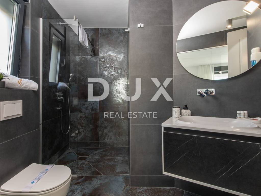 In a quiet location in Novalja, just 500 meters from the sea, there is a modern luxury villa from 2024, divided into two separate residential units. We present to you the first unit (left), which extends over 176.5 m of living space and an additional 35 m of terraces and balconies. This unit offers five spacious bedrooms and five modernly decorated bathrooms, a living room filled with natural light and a fully equipped kitchen and dining room. It stands out with a private 18 m swimming pool, a sunbathing area and a partially landscaped garden, as well as its own sauna and a wellness or fitness area. The interior is decorated in a minimalist style with a touch of luxury, equipped with underfloor heating, air conditioning, smart TVs, fast Wi-Fi and top-quality materials in all rooms, including designer bathrooms and carefully selected furniture. A landscaped garden with a barbecue and an outdoor dining area provides additional space for relaxation, while the view of the sea and the surrounding landscape further contributes to the impression of complete privacy and peace. The villa is located in an ideal position, sufficiently secluded from the city bustle, and yet only a few minutes walk from the center of Novalja, the nearest beach, shops, bakery and bus station to Zrće. Zadar Airport is 86 kilometers away. This property represents an excellent opportunity for luxurious family life, a vacation with a high degree of privacy or an investment in a tourist rental without additional investments, since it is sold fully furnished and ready to use. The island of Pag - an island of stone, salt and unique energy Known as the island of the moon landscape, it is one of the most special pearls of the Croatian Adriatic. Its dramatic beauty stems from the contrast: raw stone and clear sea, untouched nature and dynamic entertainment, millennial tradition and modern luxury. Pag is home to top-notch delicacies - the famous Pag cheese, lamb and salt - but also unique lace, under UNESCO protection. Authentic Mediterranean towns like Pag and Kolan offer peace and tradition, while Novalja and Zrće attract guests from all over the world who are eager for music, life and freedom. The island offers numerous hidden coves, hiking and cycling trails, clear sea and a rich cultural heritage. Whether you come for hedonism, relaxation, exploration or investment Pag offers something special. It is not just a destination it is an experience. Dear potential buyers, we are glad that you are interested in the properties from our offer. For more information and an agreement regarding a property viewing, please feel free to contact us. Property viewing is possible only with the signing of a real estate brokerage contract.