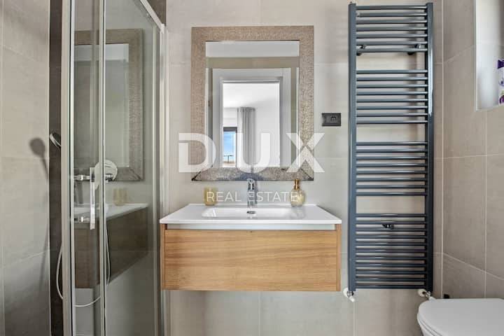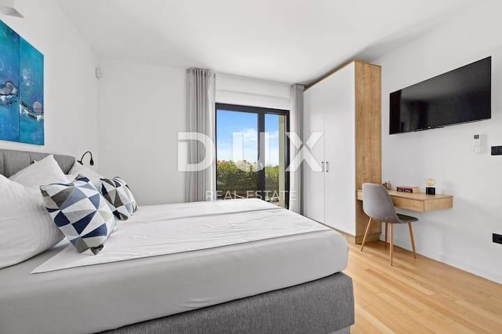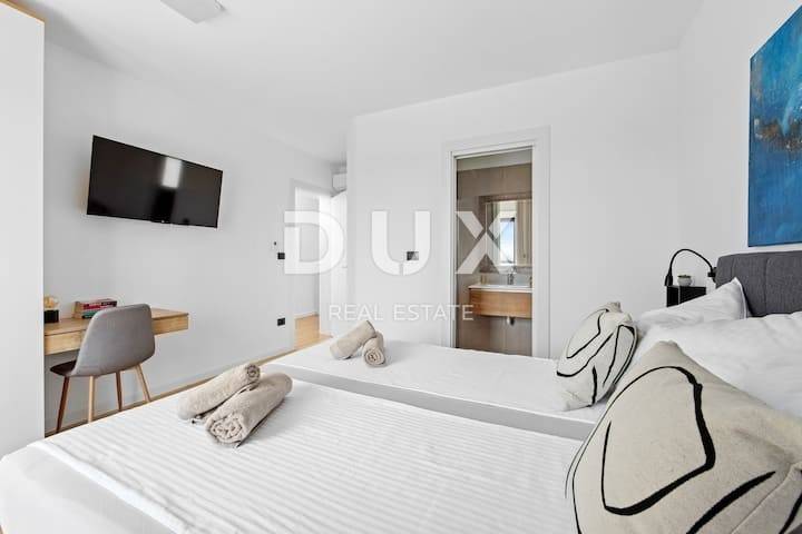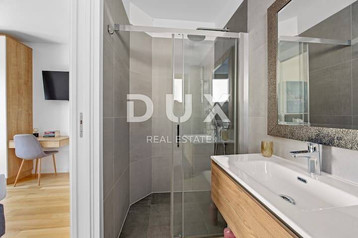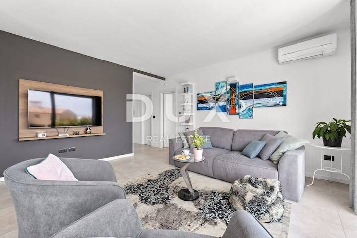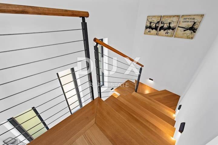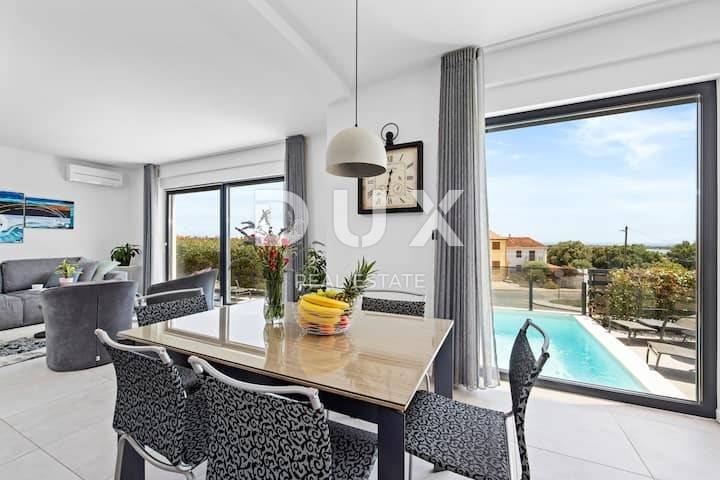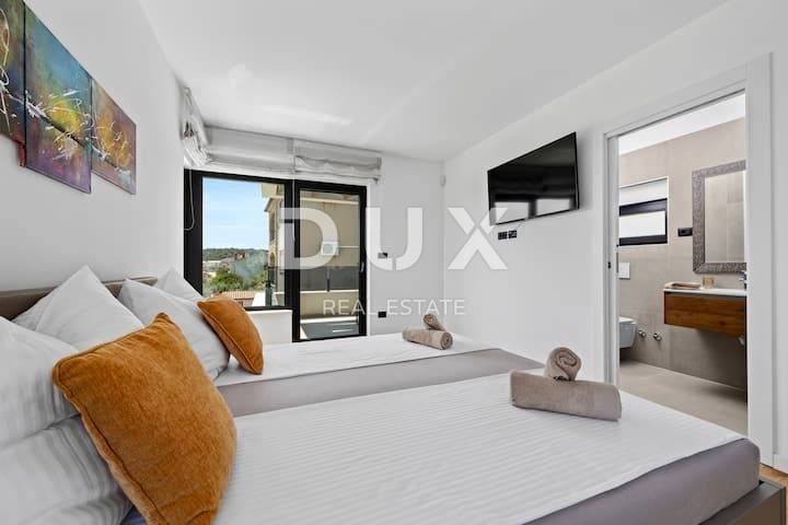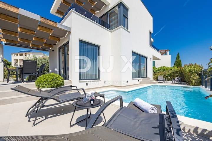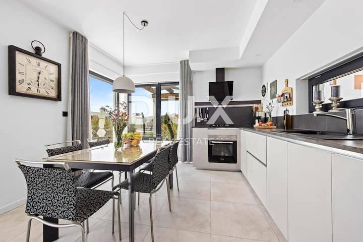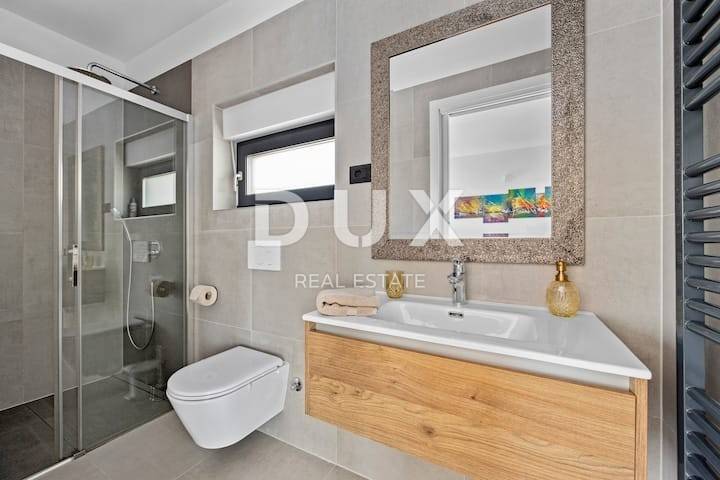 In a quiet part of Ližnjan, just a few minutes walk from the beaches and all the amenities needed for life, this modern detached villa is located - a property that combines contemporary comfort, attractive design and private outdoor space with a preserved panoramic sea view. The villa extends over two floors, has a total area of 130 m, and is located on a landscaped and fenced plot of 450 m, with a swimming pool and a Mediterranean garden. This villa represents the perfect balance of architecture, functionality and location by the sea. VILLA DESCRIPTION: The ground floor of the villa consists of an entrance hall with a designated space for a wardrobe, which then introduces us to the open living room with dining room and modernly equipped kitchen, a space dominated by large glass walls and access to a covered terrace and courtyard. The ground floor of the villa also houses a guest toilet, the first bedroom with its own bathroom and a practical storage room. An internal staircase leads us to the villa's first floor, where there are two bedrooms, each with its own bathroom and access to private terraces with panoramic sea views - a view that will remain preserved in the future thanks to the carefully chosen position of the villa. DESCRIPTION OF THE GARDEN: The villa's courtyard offers complete peace and enjoyment in the open air, there is a comfortable 25 m swimming pool with a sunbathing area, a covered dining terrace and a Mediterranean garden. The courtyard is fully fenced, and you can enjoy the sea view while having fun with friends and family. A variety of Mediterranean plants create a special atmosphere in the courtyard, while for your pets, the courtyard has a small lawn perfect for carefree play and fun. There is also a barbecue, perfect for preparing your favorite delicacies, as well as two private parking spaces, which you can cover. ADDITIONAL INFORMATION: * The villa is built and equipped with an emphasis on durability and comfort: * Central gas heating and a fireplace in the living room * Four air conditioning units, one in each bedroom and living area * Thermal insulation of the facade (8 cm polystyrene) * Floor coverings: a combination of parquet and ceramics * PVC joinery with shutters on all windows and doors * Each bathroom has its own window for natural light and ventilation * The property is sold fully furnished, with a neat ownership (1/1), a use permit and a legalized swimming pool and an auxiliary building. LOCATION: The villa is located at the end of a quiet and dead-end street, just 500 meters from the well-maintained beaches and promenades by the sea. All the amenities necessary for life or vacation are available in the immediate vicinity: shops, restaurants, schools, cafes and everything else that makes life comfortable. The villa is well connected to Pula, Medulin and the rest of Istria, and is only a 15-minute drive from Pula airport. WHO IS THIS PROPERTY FOR? This villa in Ližnjan is ideal for those looking for a modern, functional and peaceful seaside setting. Whether as a family home, a second holiday home or an investment in tourist rental this property offers the perfect combination of privacy, quality and an attractive location. FOR INVESTORS: Due to its position, attractive view, layout of the space and swimming pool, the villa has significant potential for tourist rental in the higher-end segment. Its detached concept, privacy and complete equipment make it a desirable property in the tourist offer. For additional information and to arrange a tour, we are at your disposal.
