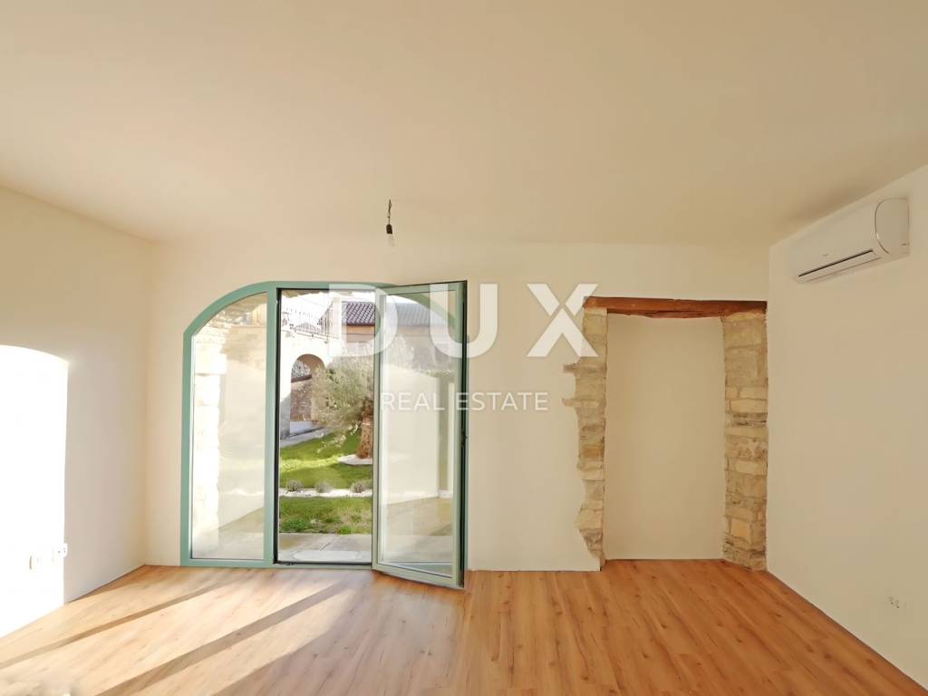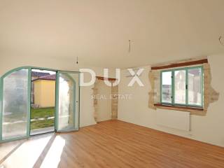 ISTRIA, BUJE - Apartment with garden. The medieval town of Buje is located in the northwestern part of the Istrian peninsula, and is located on top of a hill with a beautiful view of the sea, surrounding hills, vineyards and olive groves for which this area is famous. The proximity of the sea, the influence of the Mediterranean and mild continental climate, the tradition in agricultural production, hunting and tourism, the hilly landscape, preserved and unpolluted nature make the area of the Town of Buje one of the most attractive areas of the Istrian peninsula. In a small village located near the town of Buje, there is a semi-detached stone residential building that extends through the ground floor and two floors and contains a total of eight residential units. The renovation used durable and reliable materials that guarantee long-term satisfaction and safety of residence. The space planning of each floor was carried out in detail, which resulted in a high-quality layout of the rooms, which guarantees full utilization of the space. The subject of sale is an apartment with a living area of 76.50 m, located on the ground floor of the building. It consists of two bedrooms, one of which has access to a 2.60 m2 loggia, an office, a bathroom, a storage room, a hallway and an open-concept space that unites the living room, dining room and kitchen with access to a 20 m2 garden. The apartment has one parking space. This apartment is an opportunity for a pleasant family life as well as an investment for the purpose of tourist rental. Dear clients, the agency commission is charged in accordance with the General Terms and Conditions: www.dux-nekretnine.hr/opci-uvjeti-poslovanja
