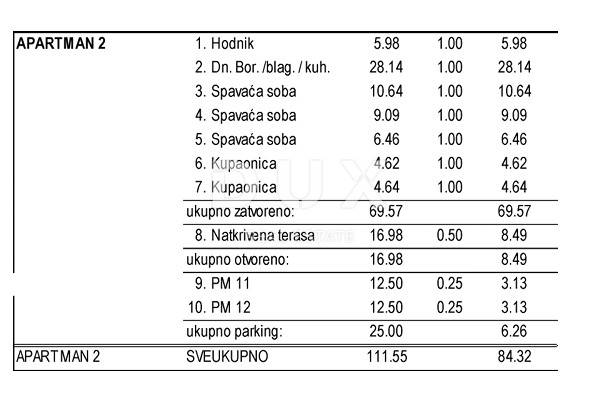 We are selling this excellent high-quality 3-bedroom + living room apartment marked A2, located on the second floor of a new residential building with a sea view. The floor area of the apartment (closed) is 69.57 m2 + covered terrace 16.98 m2 + 2 parking spaces 25.00 m2, totaling 111.55 m2 of floor area, while for the calculation with the deducted coefficients the usable area is = 84.32 m2. IDEAL APARTMENT LAYOUT, 3 separate bedrooms + living room with kitchen + 2x toilet / bathroom + storage room + covered terrace + 2 parking spaces. THE REST OF THE BUILDING: This is a building with 6 residential units, designed as two-bedroom and three-bedroom apartments, where each apartment has 2 parking spaces in ownership. Ideal room layout. The calculation is based on the net useful area (area with rejected coefficients). Top equipment: Rehau PVC carpentry, 7 chambers, 3 seals, three-layer glass, mosquito nets on the windows, top-quality interior carpentry, ceramics and parquet in the rooms. First-class sanitary ware - Grohe, Villeroy and Boch... Underfloor heating in all rooms, Samsung air conditioners, cooling and heating in all rooms. living rooms and rooms, glass fences... Connection for charging electric or hybrid vehicles. Planned construction completion date and occupancy 07/15/2025.