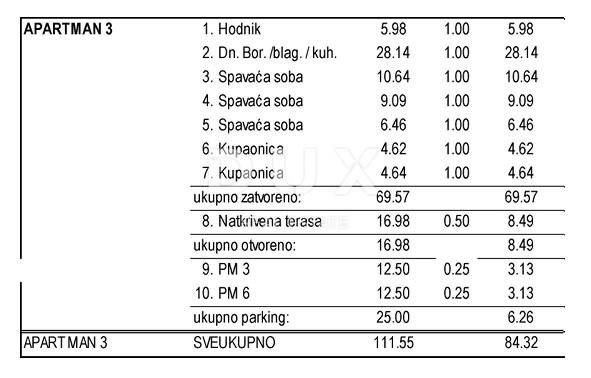 We are selling this excellent high-quality 3-bedroom + living room apartment marked A3, located on the second floor of a new residential building with a sea view. The floor area of the apartment (closed) is 69.57 m2 + covered terrace 16.98 m2 + 2 parking spaces 25.00 m2, totaling 111.55 m2 of floor area, while for the calculation with the deducted coefficients the usable area is = 84.32 m2. IDEAL APARTMENT LAYOUT, 3 separate bedrooms + living room with kitchen + 2x toilet / bathroom + storage room + covered terrace + 2 parking spaces. REST OF THE BUILDING: This is a building with 6 residential units, designed as two-bedroom and three-bedroom apartments, where each apartment has 2 parking spaces in ownership. Ideal room layout. The calculation is based on the net useful area (area with rejected coefficients). Top equipment: Rehau PVC carpentry, 7 chambers, 3 seals, three-layer glass, mosquito nets on the windows, top-quality interior carpentry, ceramics and parquet in the rooms. First-class sanitary ware - Grohe, Villeroy and Boch... Underfloor heating in all rooms, Samsung air conditioners, cooling and heating in all rooms. living rooms and rooms, glass fences... Connection for charging electric or hybrid vehicles. Planned date of completion and occupancy 15/07/2025