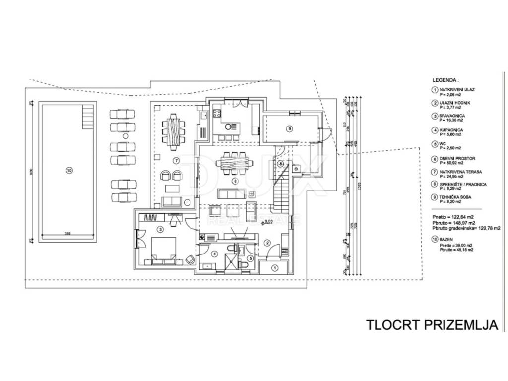 Prizemlje (123 m) s prostranim dnevnim boravkom, moderno dizajniranom kuhinjom s blagovaonicom, ulaznim hodnikom, jednom spavaćom sobom s vlastitom kupaonicom, dodatnim WC-om, spremištem/praonicom, tehničkom sobom i natkrivenom terasom.