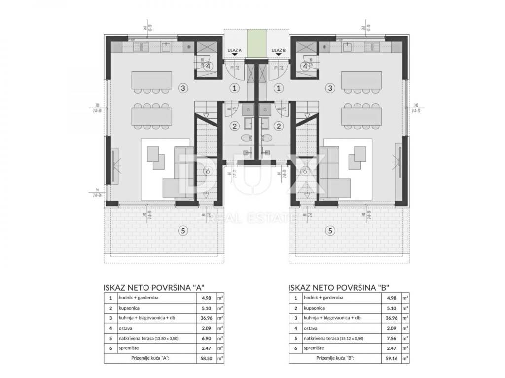 At the southernmost point of the Istrian peninsula is located the coastal jewel - the town of Medulin, one of the most famous representatives of Istrian tourism. It is the center of the popular Medulin Riviera, built on the remains of prehistoric settlements, which includes the surrounding very attractive places; Premantura, Pješčana Uvala, Pomer, Vinkuran, Vintijan, Valbonaša and Banjole. This area also boasts the Medulin archipelago with 11 uninhabited islands and islets. The entire idyllic area represents an exceptional, significantly preserved ambient value. This ideal combination of nature and history has not lost its luster for centuries. The reason for this is the mild Mediterranean climate, an imposing nature park, archaeological sites, magical vistas, sandy and white pebble beaches in blue-green bays, pine forests and modern fishing villages full of Istrian tradition, cultural events and a wide range of dynamic activities. In a quiet neighborhood in Medulin, a house of modern architecture under construction is for sale. In addition to the location, the property is also characterized by the quality of construction, which guarantees long-term satisfaction and quality of living. The house, with its modern architecture, does not disturb the environment, but creates a synergy of the natural environment and modern design, and is designed as a residential building with two residential units that extend over two floors. The areas of the residential units are 118.87 m and 119.53 m. The ground floor of each residential unit consists of an open-concept space that unites the kitchen, dining room and living room with access to a covered terrace, bathroom and storage room, while the first floor of each residential unit consists of three bedrooms with private bathrooms. The stated price refers to the unfinished construction of the residential building up to the rough construction phase, which allows for final decoration according to your own wishes and preferences. Possibility of purchasing the property in the final stage of construction without furniture and with a landscaped garden with a price adjustment. The excellent location and the spatial organization of the interior and exterior of this property provide an opportunity for a comfortable family life or an investment investment in a tourist rental business.