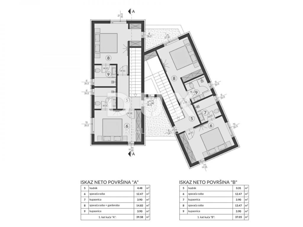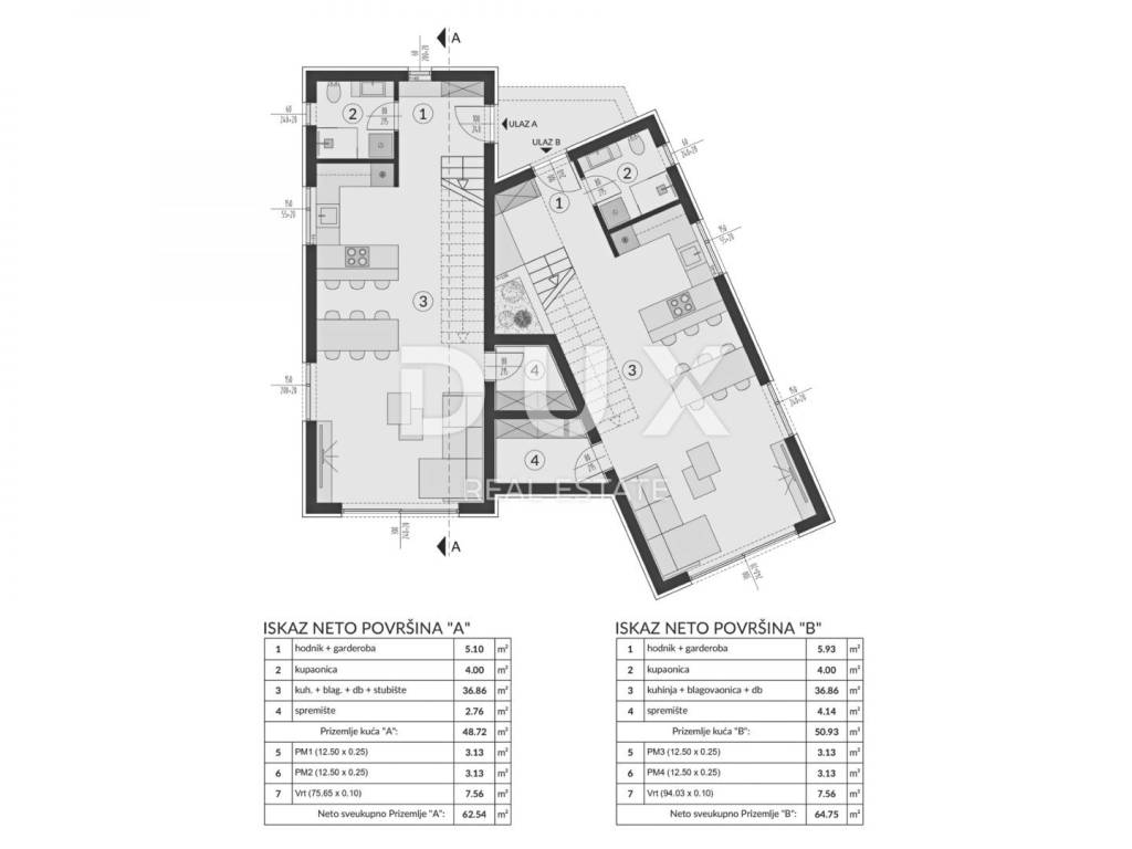 At the southernmost point of the Istrian peninsula is located the coastal jewel - the town of Medulin, one of the most famous representatives of Istrian tourism. It is the center of the popular Medulin Riviera, built on the remains of prehistoric settlements, which includes the surrounding very attractive places; Premantura, Pješčana Uvala, Pomer, Vinkuran, Vintijan, Valbonaša and Banjole. This area also boasts the Medulin archipelago with 11 uninhabited islands and islets. The entire idyllic area represents an exceptional, significantly preserved ambient value. This ideal combination of nature and history has not lost its luster for centuries. The reason for this is the mild Mediterranean climate, an imposing nature park, archaeological sites, magical vistas, sandy and white pebble beaches in blue-green bays, pine forests and modern fishing villages full of Istrian tradition, cultural events and a wide range of dynamic activities. In a quiet neighborhood in Medulin, a house with modern architecture with two residential units is for sale. In addition to the location, the property is also characterized by the quality of construction, which guarantees long-term satisfaction and quality of living. With its modern architecture, the house does not disturb the environment, but creates a synergy of the natural environment and modern design, and is designed as a residential building with two residential units that extend over two floors. The areas of the residential units are 88.3 m and 87.98 m, and each has two parking spaces and a garden. The ground floor of each residential unit consists of an open-concept space that unites the kitchen, dining room and living room, bathroom and storage room, while the first floor of each residential unit consists of two bedrooms with private bathrooms. The stated price refers to the unfinished construction of the residential building up to the rough construction phase, which allows for final decoration according to your own wishes and preferences. Possibility of purchasing the property in the final stage of construction without furniture and with a landscaped garden with a price adjustment. The excellent location and the spatial organization of the interior and exterior of this property provide an opportunity for a comfortable family life or an investment investment in the tourism business in renting.