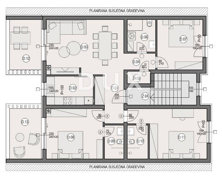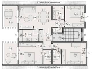 This multi-apartment building is located just a few minutes from the city center, in an extremely frequent and sought-after location. Surrounded by other residential buildings and 100m from the main road, in a quiet street, it offers peace and privacy. Close to the city, city beaches, public transport, fitness halls, markets, schools and kindergartens. The property in question is a penthouse with a garage! Area: 111.73 m2 The apartment will be equipped with quality ceramics and sanitary ware, air conditioning and underfloor heating in the bathroom (it is possible to install underfloor heating in the entire apartment as well) Apartment D includes: entrance area/corridor 6.30 m2 living room 22.14 m2 kitchen 7.14 m2 corridor 2.46 m2 storage room 1.52 m2 bathroom 1 4.82 m2 room 1 12.04 m2 room 2 14.86 m2 bathroom 2 3.43 m2 bathroom 3 3.68 m2 room 3 16.91 m2 Area: 94.93 m2 covered terrace 8.40 m2 covered terrace 8, 40 m2 Total area of the apartment: 111.73 m2 garage G01 19.80 m2 Start of construction 09/2024, and planned completion and occupancy 10/2025 We are available for all other questions!