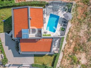 This beautiful holiday home with an attractive and modern design is located in the famous tourist town of Medulin, near the sea. It is furnished with quality style furniture and meets the highest standards of modern tourism. On the ground floor there is a living room with a view of the pool, a kitchen and a bathroom, and on the upper floor there are 4 bedrooms and three bathrooms. In the basement of the house there is a space for hanging out with a lot of board games for both adults and children. The house has another additional one-bedroom apartment. Here you will surely enjoy the beautiful panoramic view of the sea and sunsets, from the bedroom. On the ground floor of the house there is also a special corner intended for the entertainment of your youngest. From the living room, you go out to the terrace, in the continuation of which there is a sunbathing area ideal for relaxation and a 30m2 swimming pool where you can look for refreshment during hot summer days. Additional features: - climate inverter for heating and cooling - video surveillance and alarm system with sensors - automatic irrigation of green areas - solar panels for hot water heating - outdoor shower - jacuzzi - 10 cm of facade insulation This is an ideal opportunity for a safe and peaceful life or as an investment option for tourist purposes.