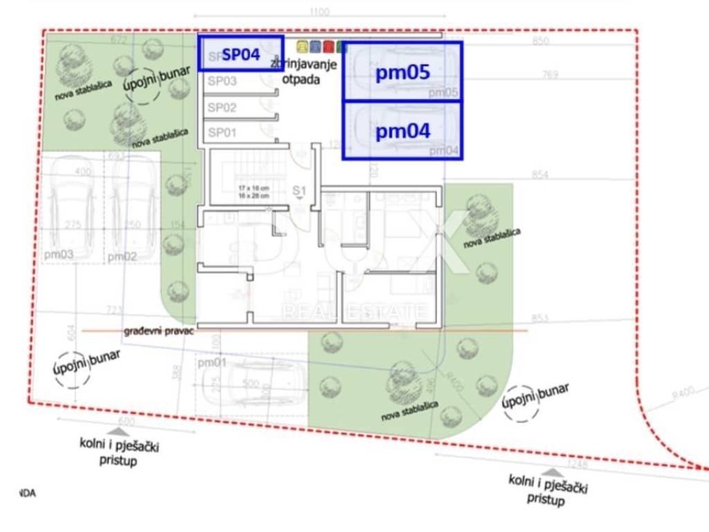 A new residential-business settlement is under construction with a total of 10 business premises and 120 apartments, a kindergarten with an attached outdoor playground for children, a 4,800 m2 garage for large buildings with 149 garage parking spaces. on the ground floor of buildings 1, 2 and 3, business premises with a kindergarten of 150 m2, a pharmacy, shops and other service activities are planned, which will provide the entire housing complex and future tenants with a new dimension of quality of life in one place. The entire project of construction of apartments, business premises and a large garage will exude an ultra-modern architectural solution and design with excellent traffic connections to the city, with organized paths for bicycles, pedestrians and bus lines. Beautiful beaches are only a few minutes' drive away (Štinjan, Hidrobaza, Valbandon, Fažana, Brijuni). All facilities such as the most modern elementary school only 900 m from the project location, a gas station, numerous shopping centers and catering facilities with a wide range of offers as well as the future new clinic and sports and recreational facilities are located in the immediate vicinity. All apartments on the higher floors will have large covered balconies with an unforgettable view of the Fažana archipelago and the sea. Large buildings will be equipped with an elevator with an entrance station in the garage to each floor as well as an internal staircase. The exterior and interior decoration of the building and apartments will meet high construction quality criteria as well as a high energy certificate A+: thermal facade system, Apartment equipment: - floor heating and cooling system with inverter air conditioners in the living area of the apartment and all rooms, - top quality Italian ceramics and laminates first class, - entrance burglar and fire doors with coded keys, - residential carpentry made of high-quality PVC/ALU profiles glazed with double IZO glass filled with argon, - bathrooms will be fully equipped with sanitary devices and top-quality equipment with built-in el. floor heating. Mediterranean plants and trees will be planted in the building environment, which will raise the entire project to a higher level. The completion of the project is expected at the end of 2026. Five large residential buildings offer apartments of 45-85 m2 with an elevator and an underground garage, while nine smaller buildings offer apartments of 55-118 m2. We offer an apartment on the second floor of the building. It consists of an entrance hall, a kitchen with a dining room and a living room, three bedrooms, two bathrooms, a loggia and a balcony. The apartment has a storage room and two outdoor parking spaces. SW orientation. Financing model: down payment of 30,000.00 + 4-5 equal installments during construction from the foundation slab, rohbau phase, installation of installations and facade to the completion of construction + 7,000.00 final installment upon obtaining the use permit. It is also possible to purchase real estate according to the purchase model on credit and the combined model (on installments and credit). For more information, feel free to contact us.