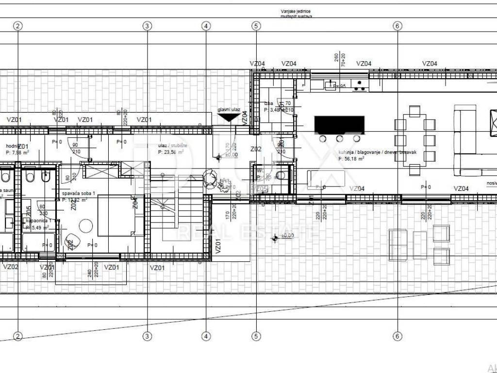 Prizemni dio sastoji se od velikog svijetlog dnevnog boravka, kuhinje i blagovaonice, sve smješteno unutar 56 m2. Tu se nalazi i mala izba (spremište) te wc. Iz dnevnog dijela izlazi se na natkrivenu terasu od 21 m2.