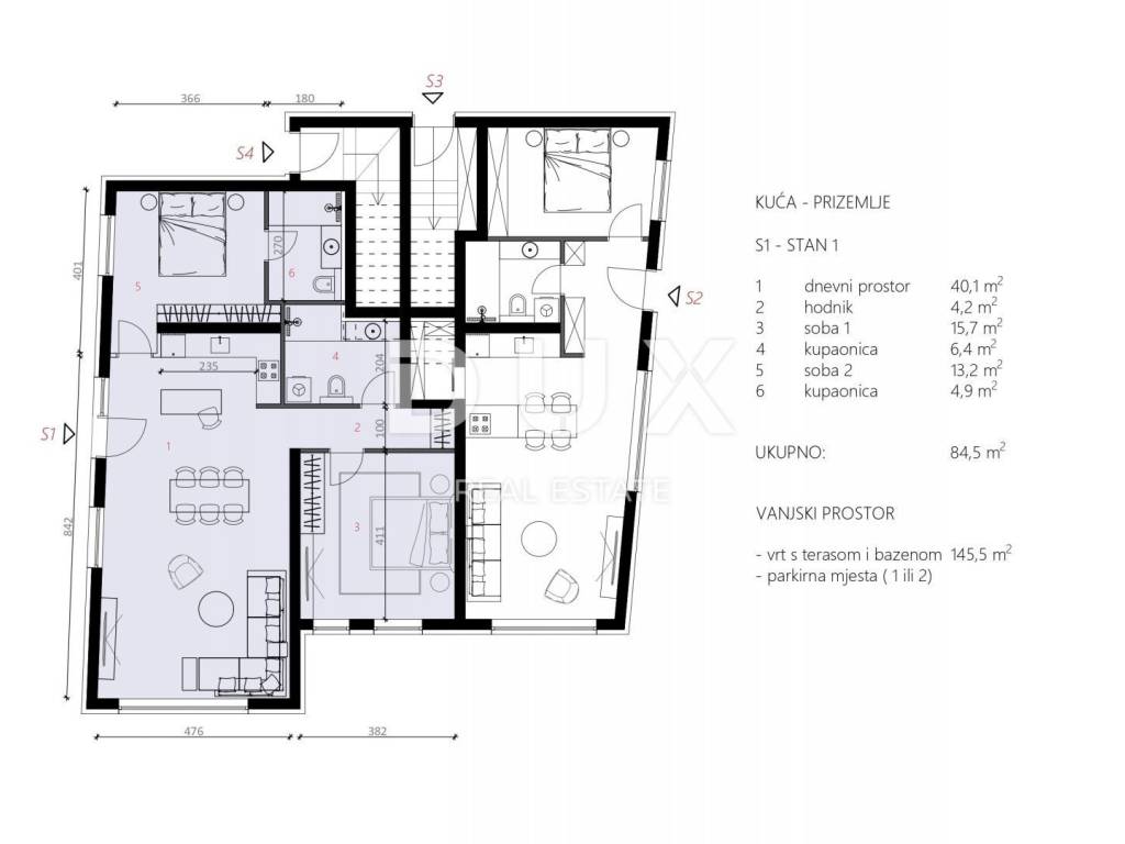 We are selling this beautiful 2 bedroom apartment S-1 on the ground floor of a modern and quality residential building with only four apartments. It consists of an open space living area with a kitchen and dining room with access to its own garden with a swimming pool and garden, two bedrooms, the master bedroom of which has its own bathroom and another bathroom. This modern project is in the process of issuing a building permit to start construction. In this early stage of waiting for the building permit, there is still the possibility of repurposing the interior space according to the buyer's wishes in agreement with the seller. In the construction itself, only the best materials and equipment that are currently on the market will be used. There is underfloor heating plus air conditioning in all rooms. The apartment has two owned parking spaces. An excellent price-quality ratio gives this property its uniqueness. Dear clients, the agency commission is charged in accordance with the General Business Conditions www.dux-nekretnine.hr/opci-uvjeti-poslovanja