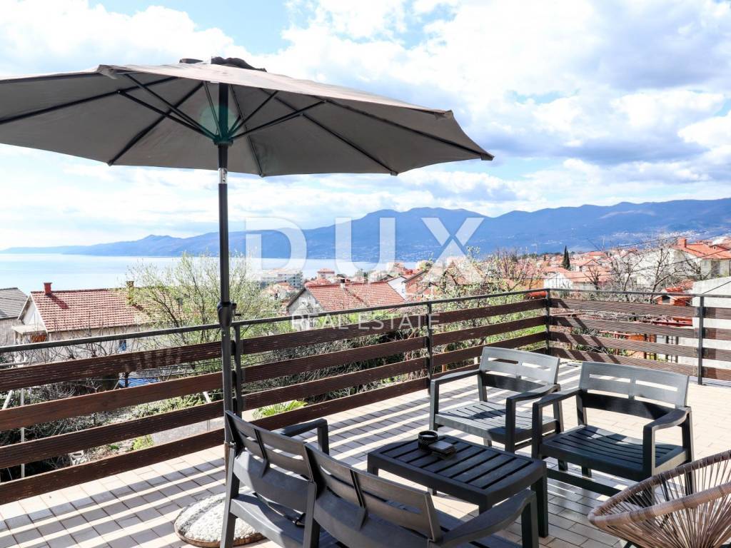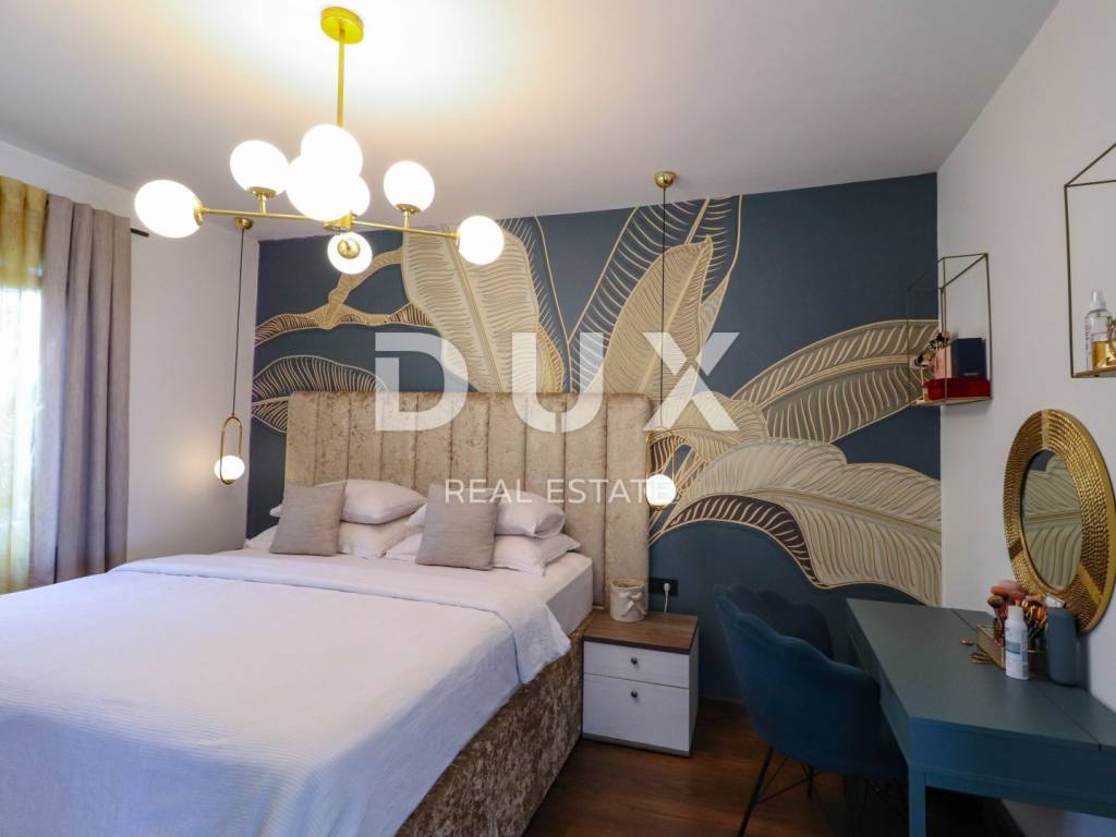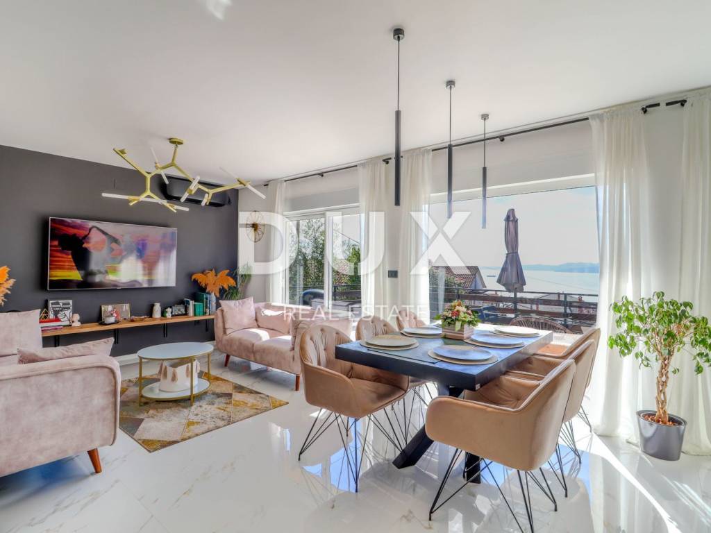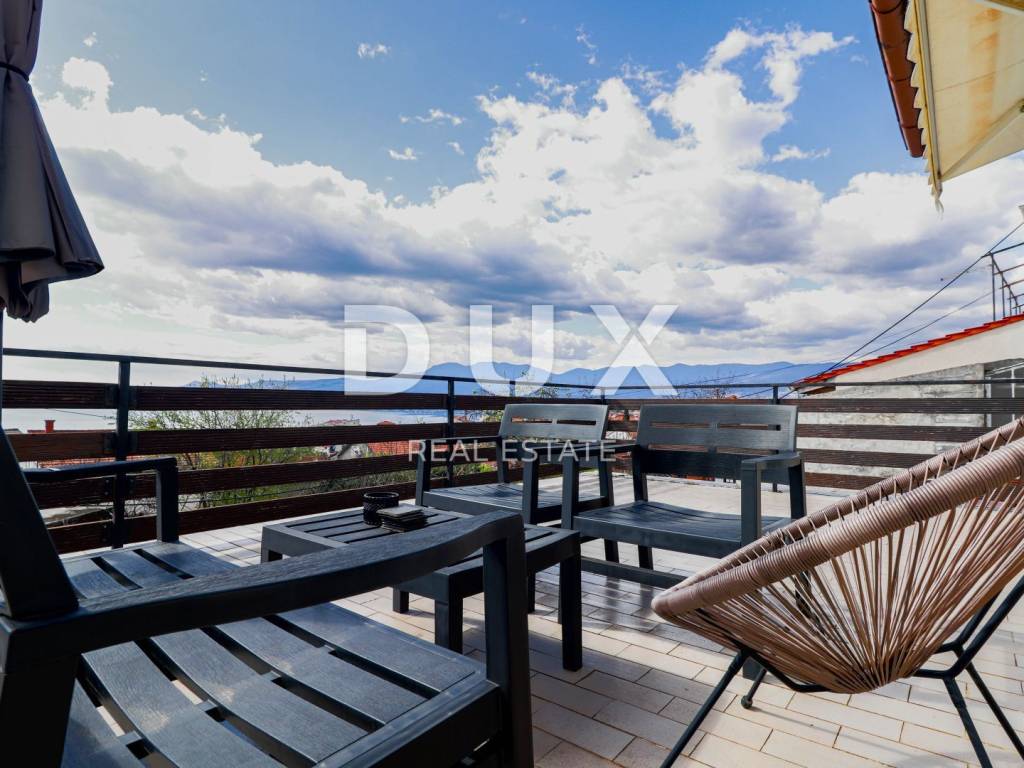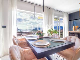 The house consists of a ground floor and a first floor. The apartment on the first floor consists of a hallway, a bathroom, two bedrooms, a spacious living room with a kitchen and a dining room with a total area of 80 m2 and a terrace of 40 m2 with a panoramic view of the sea. The apartment was completely decorated in 2020. New electricity and water installations, underfloor heating with a heat pump, floor and wall coverings were installed. On the ground floor of the house is an unfurnished space of 40 m2. Parking for several vehicles is provided in the garden.