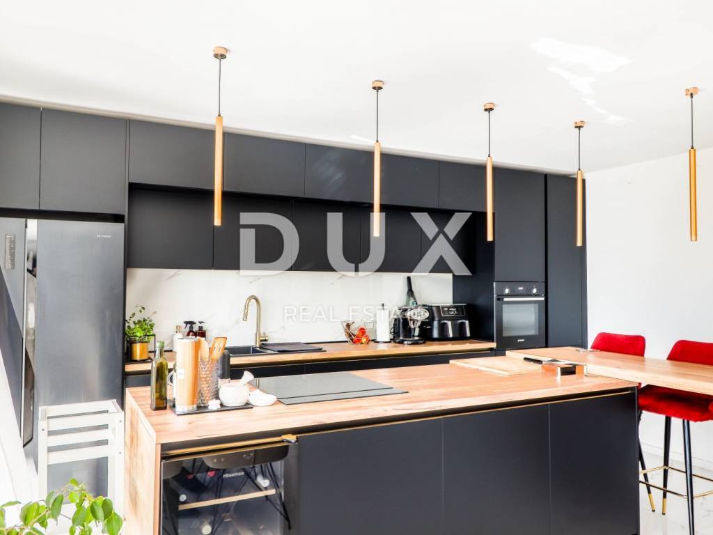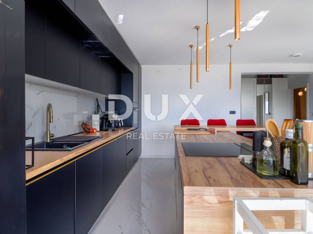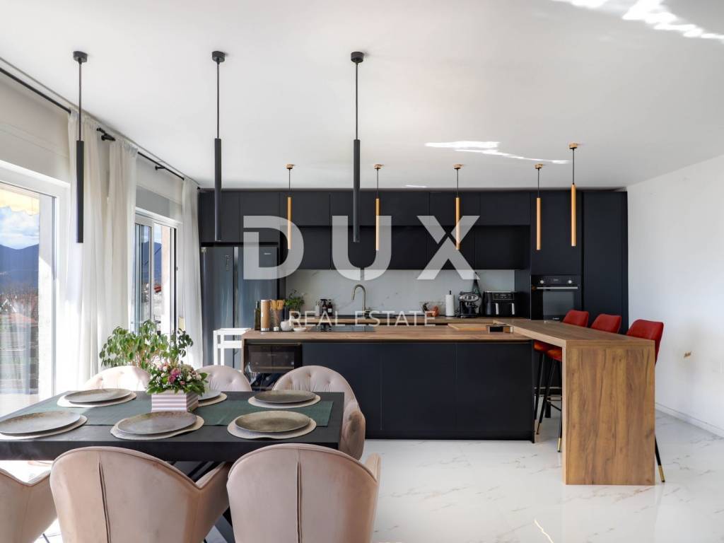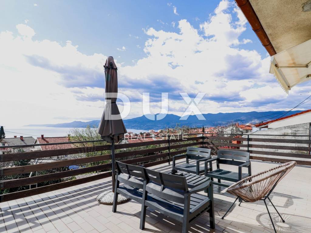 The house consists of a ground floor and a first floor. The apartment on the first floor consists of a hallway, a bathroom, two bedrooms, a spacious living room with a kitchen and a dining room with a total area of 80 m2 and a terrace of 40 m2 with a panoramic view of the sea. The apartment was completely decorated in 2020. New electricity and water installations, underfloor heating with a heat pump, floor and wall coverings were installed. On the ground floor of the house is an unfurnished space of 40 m2. Parking for several vehicles is provided in the garden.
