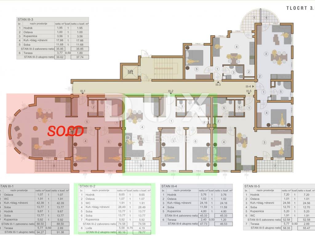 We are proud to present a new construction project located in an interesting location in the city of Pula. Namely, the building is located only a 3-minute drive from the city center, and it is also only a 5-minute drive from the famous tourist resort of Verudela. The building is positioned in a quiet location, without a lot of traffic in the vicinity of its contents necessary for everyday life. The building consists of several residential units that extend from the ground floor of the building to the 3rd floor. Next to the building, there are parking spaces in the garden of the building, as well as in the building's garage, while future apartment owners have the option of choosing a parking space for their tin pets. DESCRIPTION OF THE APARTMENT; Thus, in this building, we are proud to present an apartment on the 3rd floor, which consists of a total of 78.77m2 NET usable area. The apartment is organized so that the entrance to the apartment has a corridor that separates the apartment space into a private space and a space for daily life and entertainment. Thus, in the private area of the apartment there are 2 spacious bedrooms, one larger bathroom and a smaller storage room. There is a guest toilet along the corridor next to the entrance to the apartment. The space for daily life is designed as a larger "open space" space, and there is a spacious kitchen, a comfortable dining room and a larger living room. This entire space is flooded with natural light that penetrates into the apartment through large glass walls. From the living room there is an exit to the outdoor terrace. * Customers have the opportunity to choose to buy a parking space, either in the building's garden or in the building's garden; - Parking lot in the building's garden; 7,850.00 - Parking in the garden depending on the square footage: from 20,520.00 to 46,760.00 - Storage room depending on the square footage; from 9,870.00 to 13,250.00 TECHNICAL AND ADDITIONAL DATA; * Each apartment in the building will be equipped with electric underfloor heating * High-quality PVC joinery will be installed * Facade insulation 10 cm * The building has an elevator that connects the garage to each floor of the building * High-quality ceramics will be installed on the floors (for now, customers have the option of influencing !) * The possibility of moving in is planned for the beginning of 2025 LOCATION DESCRIPTION; The building is located in a quiet location in the city of Pula, only a 3-minute drive from the city center, and only a 5-minute drive from the famous tourist resort known as Verudela. On Verudela you can find a large number of rocky and stony beaches with crystal clear sea, and in the immediate vicinity of the building there are numerous restaurants, cafes, as well as a market, next to the building there is also a small shop, as well as everything you need for a safe and peaceful everyday life of modern man. In short, this is a property worthy of your attention, which can serve as an ideal option for a private investment or as an option for a real family home. For any additional questions, necessary information or wishes to organize an appointment to view the location and the current construction status, feel free to contact us! Dear clients, the agency commission is charged in accordance with the General Business Conditions: www.dux-nekretnine.hr/opci-uvjeti-poslovanja