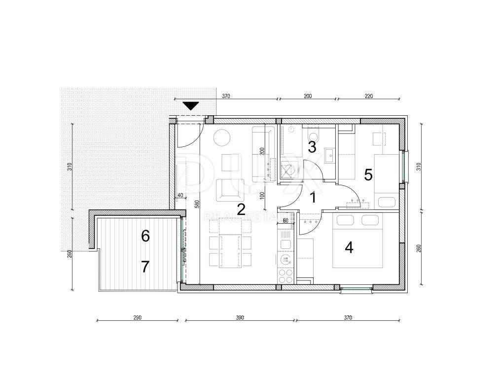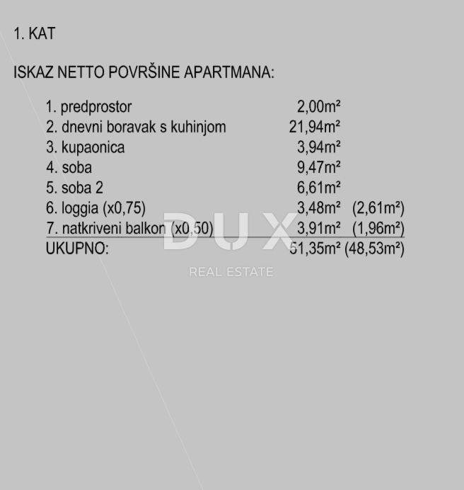 Beautiful apartment for sale in Novalja on the island of Pag. The apartment is located on the second floor of a residential building. It consists of: entrance hall, hall, living room with kitchen, bathroom, 2 bedrooms, loggia, covered balcony, 1 parking space. Total net area: 69.81m2. Total gross area: 85.16m2. It is an attractive location with a wonderful view of the sea, just a few minutes from the beach. Quality new construction of modern architecture. High-quality PVC joinery with three-layer glass, mosquito nets and electric aluminum blinds. Underfloor heating has been installed in all rooms, as well as air conditioning for heating and cooling in the bedrooms and living room. First-class sanitation, burglar-proof entrance door. Ready to move into in the 5th month of 2024. The real estate is in the VAT system (legal entity) and the buyer does not pay real estate sales tax. Dear clients, the agency commission is charged in accordance with the General Business Conditions www.dux-nekretnine.hr/opci-uvjeti-poslovanja