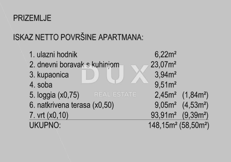Beautiful apartment for sale in Novalja on the island of Pag. The apartment is located on the ground floor of the building. It consists of: entrance hall, living room with kitchen, bathroom, bedroom, loggia, covered terrace, garden (93.91m2), 1 parking space. Total net area: 61.75m2. Total gross area: 161.15m2. It is an attractive location with a wonderful view of the sea, just a few minutes from the beach. Quality new construction of modern architecture. High-quality PVC joinery with three-layer glass, mosquito nets and electric aluminum blinds. Underfloor heating has been installed in all rooms, as well as air conditioning for heating and cooling in the bedrooms and living room. First-class sanitation, burglar-proof entrance door. Ready to move into in the 5th month of 2024. The real estate is in the VAT system (legal entity) and the buyer does not pay real estate sales tax. Dear clients, the agency commission is charged in accordance with the General Business Conditions www.dux-nekretnine.hr/opci-uvjeti-poslovanja