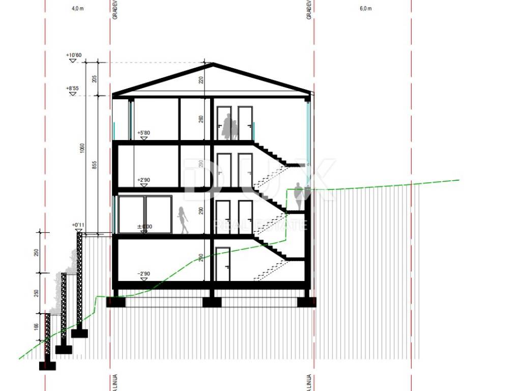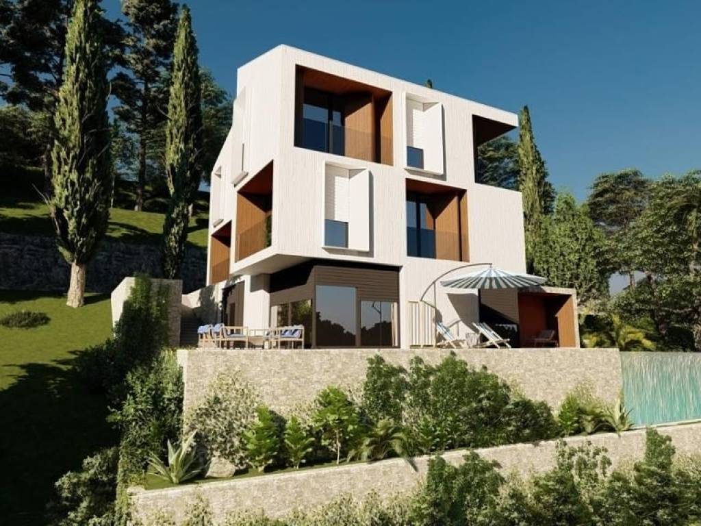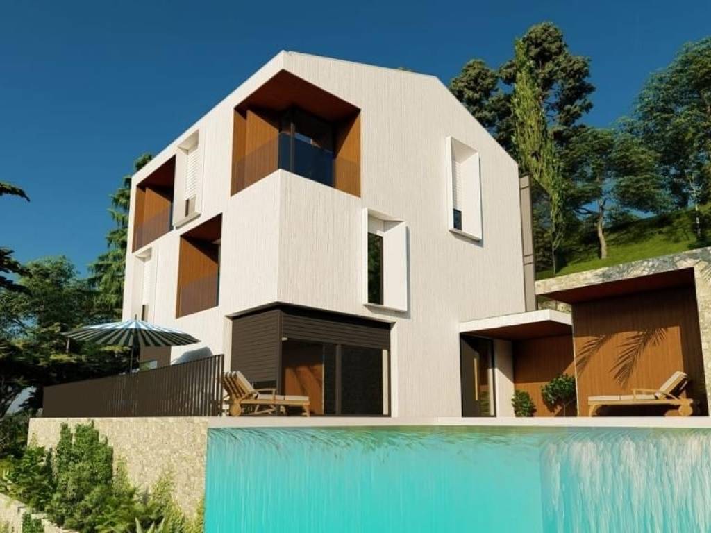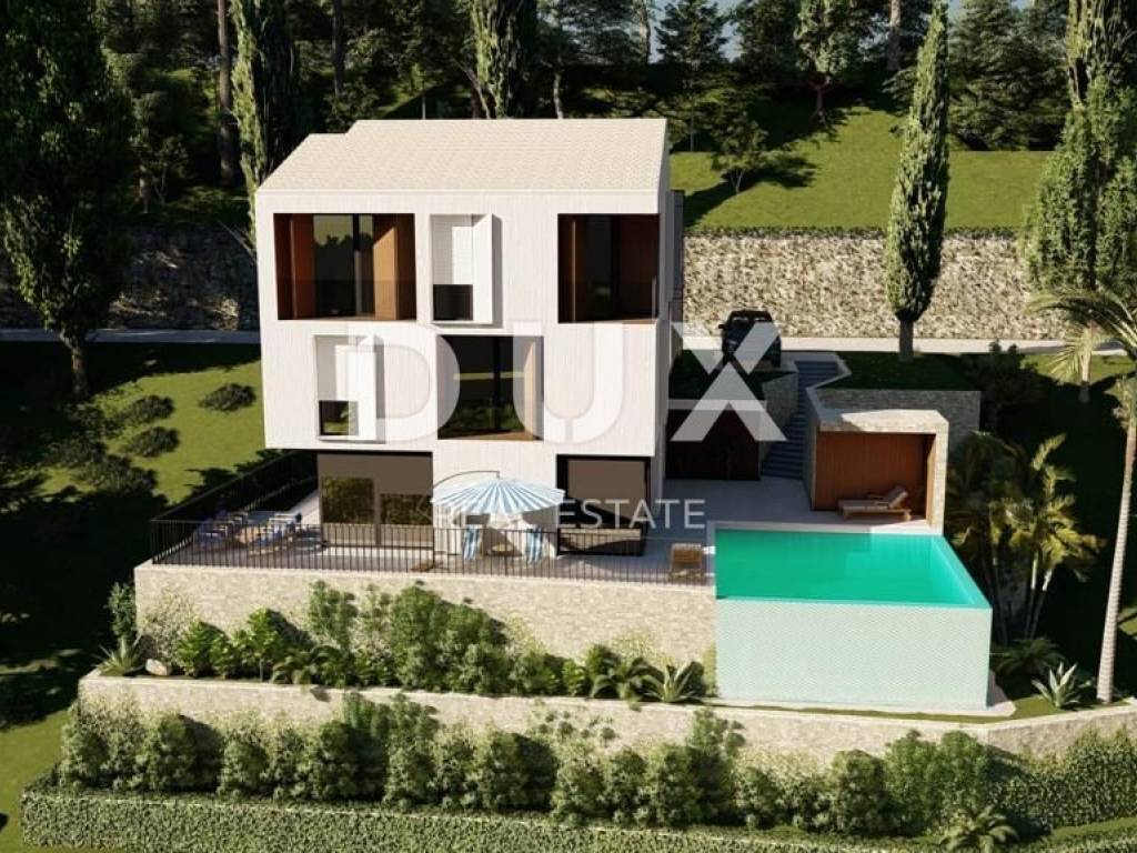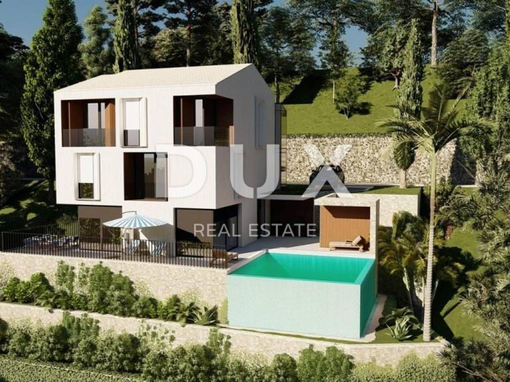 We offer a unique opportunity to become the owner of a beautiful villa on the Opatija Riviera. The villa is ideally located, allowing you to enjoy a peaceful environment with a beautiful view of the sea, from which the house is 500m away as the crow flies. This imposing property stands out not only for its beautiful architecture but also for the top quality materials we have chosen, providing a high standard of European quality. A heat pump and underfloor heating in every room guarantee you a pleasant atmosphere throughout the year, while integrated cooling ensures freshness even on the hottest days. Through large open sliding rocks, the space will be abundant with natural light, and from the terrace or garden you will be able to enjoy a panoramic view of the sea. As for the interior space, the house will have 7 bedrooms, each of which will be decorated with attention to quality, and each of these rooms will have its own bathroom. In the basement there will be a bowling alley, indoor pool and wellness with two saunas and one jacuzzi. A garden with a southern sun terrace and an overflowing outdoor pool will make an ideal environment for relaxation. With five parking spaces, space for the vehicle is always secured. The house will be completed by January 2025, which means that you can soon enjoy life on the Opatija Riviera. The drive to the coast takes only two minutes, while a gentle walk downhill will take you to the beautiful beach within 7 minutes. Dear clients, the agency commission is charged in accordance with the General Business Conditions: www.dux-nekretnine.hr/opci-uvjeti-poslovanja