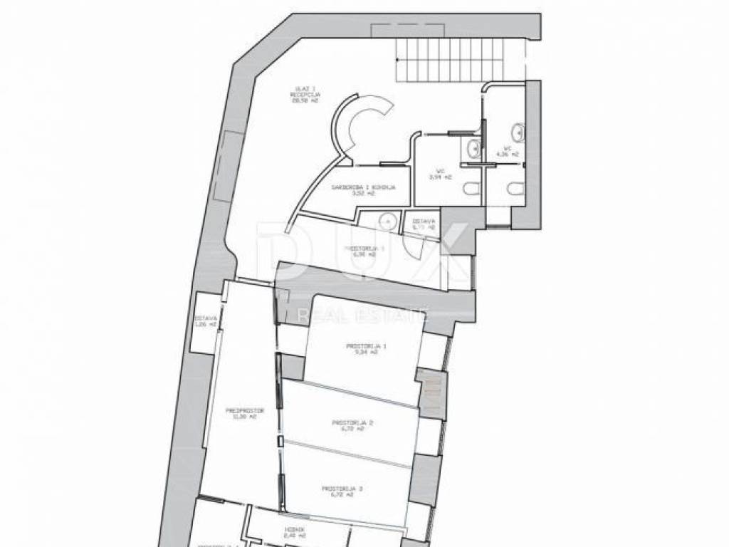 We offer an apartment on the ground floor of an office building, which is essentially an office space consisting of 5 separate rooms, 2 bathrooms and a kitchen, total area 109m2. There are plenty of parking spaces in front of and around the office building. Clean and tidy property. Dear clients, the agency commission is charged in accordance with the General terms and conditions of business: www.dux-nekretnine.hr/opci-uvjeti-poslovanja Dear potential buyers, tenants and lessees, viewing the property that you are interested in and in which you have an interest is possible only and exclusively with the signing of the Real Estate Brokerage Agreement, for the purpose of protecting the owner of the property from visits by unregistered persons, and in accordance with the Data Protection Act and the Real Estate Brokerage Act. When viewing each property, the potential buyer/lessee/lessee is required to fill out and sign the Real Estate Brokerage Agreement, which states the following: - basic information about the potential buyer/lessee/lessee - basic information about the agency - the amount of the agency commission The agency commission for the buyer is 3 % (+25% VAT) of the total agreed purchase price. The agency commission for the lessee is one monthly rent (+ 25% VAT).