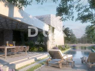 The medieval town of Labin is located on a 320-meter high hill and only three kilometers from the sea, the tourist town of Rabac. His old name Albona was first mentioned in 285. Today it is a cultural and administrative center with highly developed tourism. The old town offers many attractive views of Rabac and the islands. Intertwined with rich history and mining that marked this region, Labin, which was declared an independent republic for a short time, is today a fascinating town of contradictions; old and new, history and present, tourism and art. Not far from Rabac and Labin, in the settlement of Sv. Bartul, this nice, semi-detached, modern villa with a swimming pool and a beautiful view of the old town of Labin and the surrounding hills is for sale. Its living space of 150 m2 is spread over the ground floor and first floor, thus creating a kitchen and living room with an open space concept, three bedrooms with their own bathrooms, a separate guest toilet, a recreation room and a storage room. From the master bedroom and the living room there is an exit to a spacious terrace that offers a spectacular view of the greenery and the old town of Labin. It should be noted that these two buildings are designed in such a way that they face opposite sides, which ensures complete privacy. High-quality aluminum carpentry and aluminum glass walls provide this villa with enough light and insulating protection. It also includes video surveillance, an alarm and air conditioners with a heating and cooling system. Floor heating - a heat pump is installed in all rooms. The yard of this lovely villa extends over a plot of 330 m2 with a slight slope. It is completely surrounded by its own fence, inside which we find a lot of greenery and planted plants with an automatic irrigation system, which makes a beautiful private oasis of peace. For refreshment on summer days, there is a beautiful swimming pool with a sunbathing area, and a fully equipped summer kitchen takes care of the gourmet part. Two parking spaces are provided for your tin pets. Due to its location and fascinating view, this is an ideal investment opportunity to rent during the tourist season, but also for those who are looking for an ideal home, far from the city crowd, yet not far from all the amenities necessary for life. The distance from the first beach is 9 km, and the center of Labin is 4 km.
