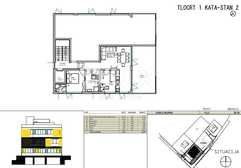 A luxury apartment in a new building in Kožino near Zadar is for sale. The apartment is located on the first floor of a two-story urban villa with an elevator. The total living area of the apartment is 87.74 m2. It consists of two bedrooms, living room, kitchen and dining room, two bathrooms and loggia. The apartment has one garage parking space, an outdoor parking space and a storage room in the basement of the building. Together with all accessories, the total area of the apartment is 104.61 m2. High-quality materials were used in the construction, aluminum carpentry with electric shutters, oak floor coverings and first-class Italian ceramics. The entire unit has water-based underfloor heating, and the apartment is fully air-conditioned. The apartment is equipped with a smart home system. The facility is 30 m from the sea and the nearest beach. The small maritime town of Kožino is 5 km from the center of Zadar. Zadar is a city with developed cultural content and the most beautiful sunset that left even the famous American director Alfred Hitchcock breathless. In the vicinity of Kožin, there are many other interesting places with beautiful beaches, such as Petrčan, Vrsi, the historic town of Nin with the longest sandy beach in Croatia, or the slightly more distant island of Pag. Dear clients, the agency commission is charged in accordance with the General Business Conditions www.dux-nekretnine.hr/opci-uvjeti-poslovanja