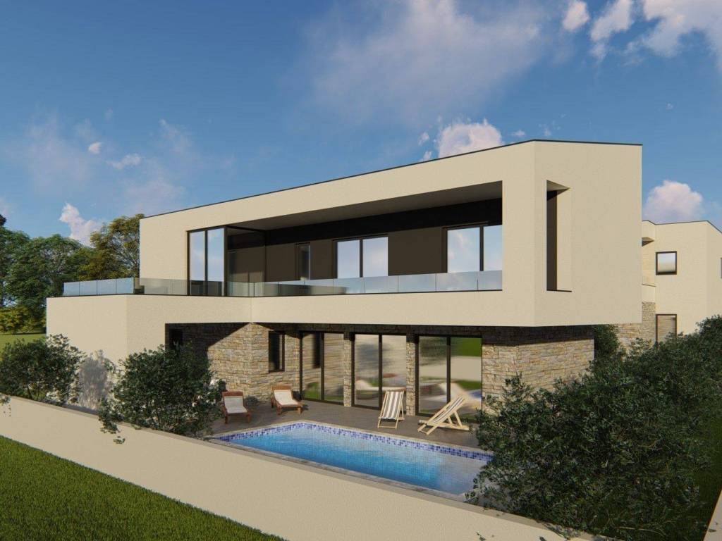 The property is located in a wonderful location surrounded by nature in a small town 2 kilometers from beautiful beaches. It consists of ground and first floor. On the ground floor there is a covered entrance, hallway, living room with kitchen and dining room with access to the outdoor terrace and pool, bathroom, and two covered terraces with a total living area of 91 m2. The internal stairs lead us to the 1st floor, where there are 3 bedrooms with 3 bathrooms, a hallway, and a covered and uncovered terrace with a total living area of 84 m2. It is located on a plot of 1000 m2 with a landscaped green area, a swimming pool of 21 m2 and two parking spaces. The house is under construction and the buyer can choose the heating and cooling system and complete interior decoration.