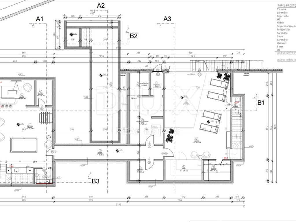 hodnik, strojarnica, TV soba, biljar soba, tri spremišta, sauna, wellness i dva wc-a. Unutarnjim stubištem dolazimo do