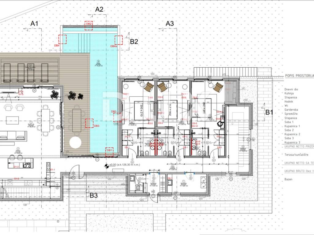 prizemlja gdje se nalaze hodnik, dnevni boravak, kuhinja s blagovaonicom, tri spavaće sobe s vlastitim kupaonicama,